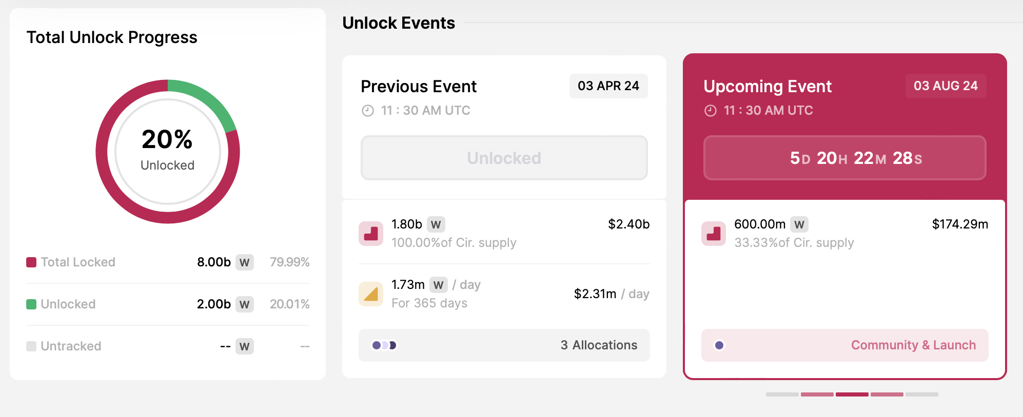 في 3 أغسطس، سيطلق وورمهول 600 مليون رمز، مما يمثل 6,02% من العرض الأقصى. لقد أثار الإصدار المخطط للرموز ردود فعل متباينة من مجتمع العملات المشفرة، حيث يرى البعض أنه تطور إيجابي للسيولة، بينما يعبر آخرون عن مخاوف بشأن التأثير المحتمل على السوق.