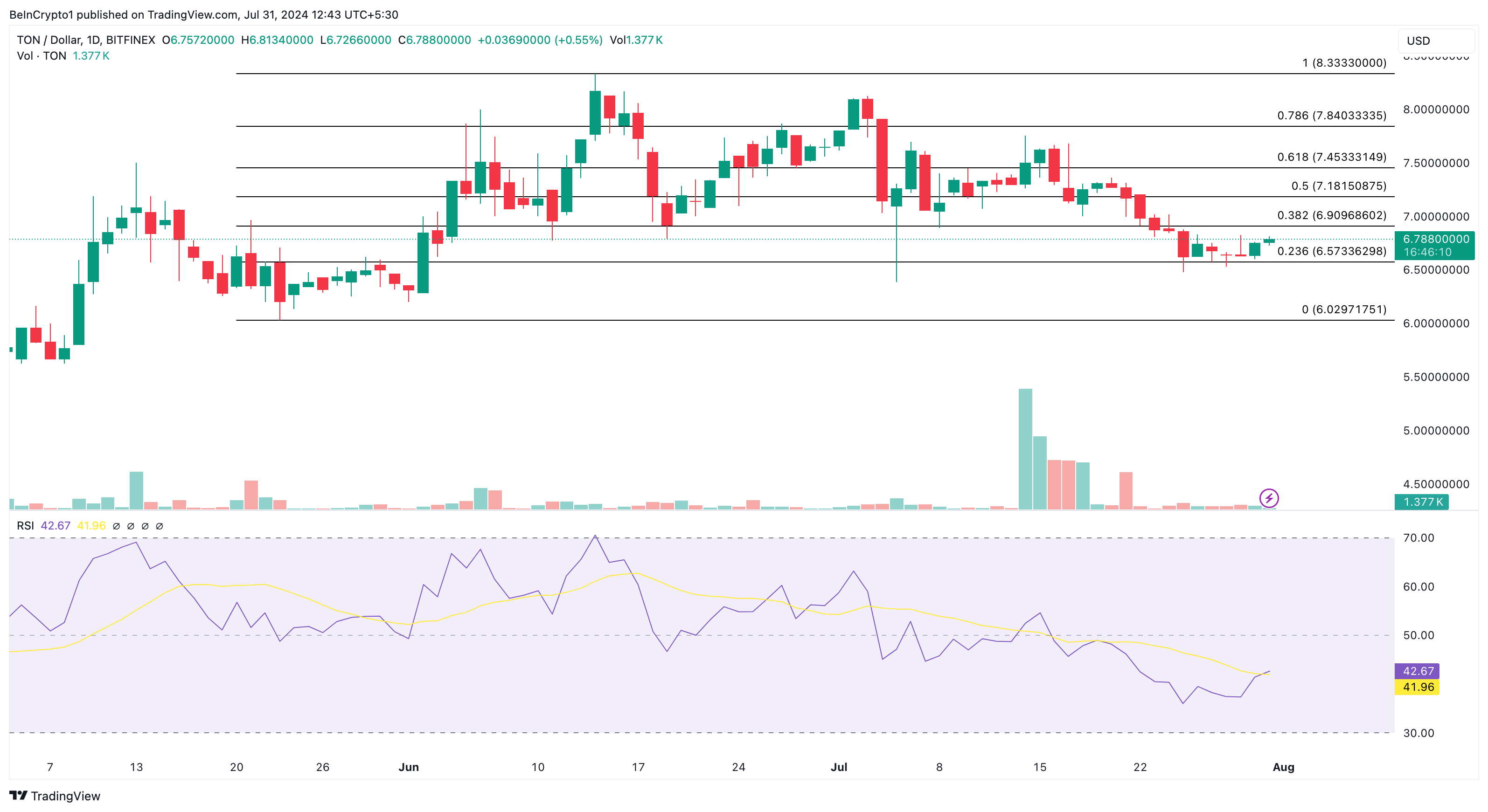 على الرغم من مواجهة مقاومة حاسمة، تعد تونكوين واحدة من العملات المشفرة التي يمكن أن تصل إلى أعلى مستوى جديد على الإطلاق في أغسطس 2024. حتى كتابة هذه السطور، يتم تداول TON بسعر 6.78 دولارًا، ومثل OM، انخفض التوكن بنسبة 17٪ عن ذروته.