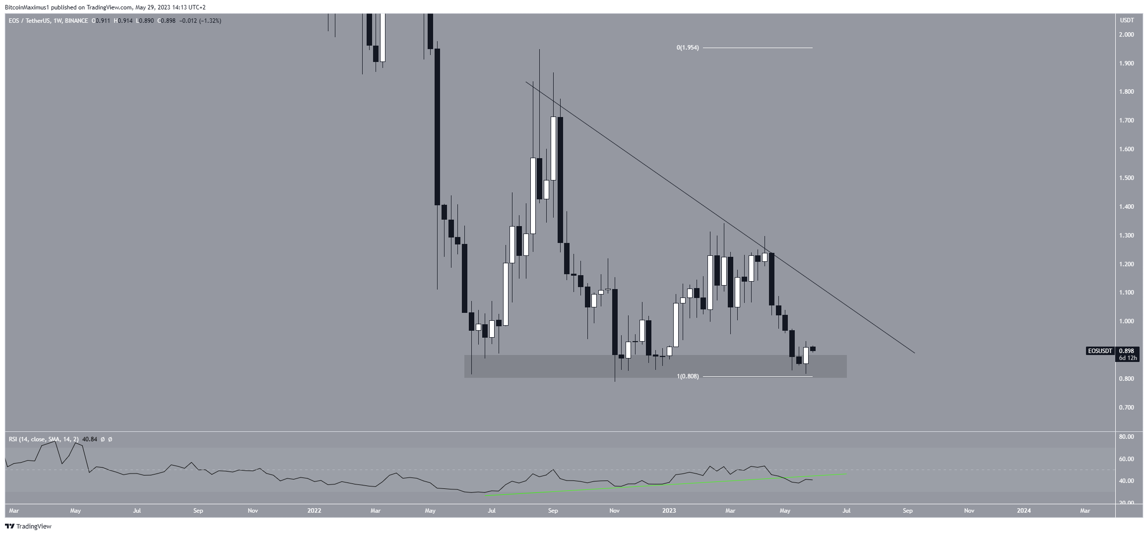 انخفض سعر العملة المشفرة منذ شهر أغسطس 2022، ليشهد ارتفاع طفيف خلال شهر أغسطس. بما أدى إلى إنشاء خط مقاومة تنازلي ثم انخفض السعر إلى منطقة الدعم الأفقية 0.85 دولار.