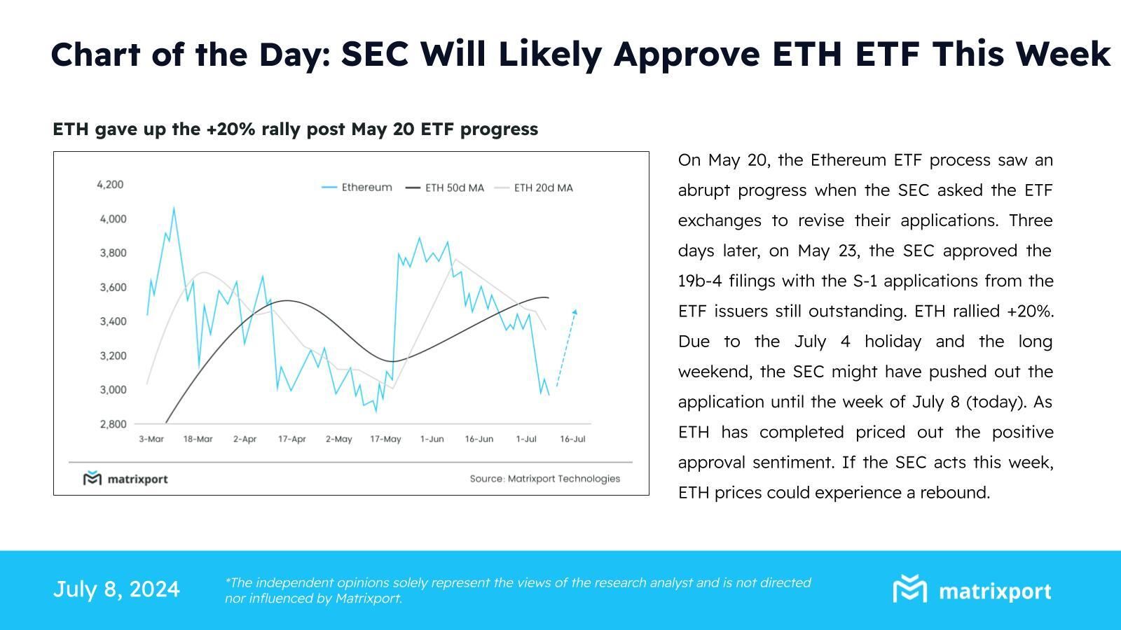 بالإضافة إلى الإطلاق المتوقع، يتوقع تقرير Matrixport تعافيًا بنسبة 12% في سعر الإيثريوم إلى 3,400 دولار. جاء هذا التكهن بعد أن قفزت الإيثريوم بنسبة 20% في مايو بعد الموافقة على النماذج 19-b. من المتوقع أن ينتقل التفاؤل الصاعد من الموافقة إلى البيتكوين، مما يدعم التعافي.