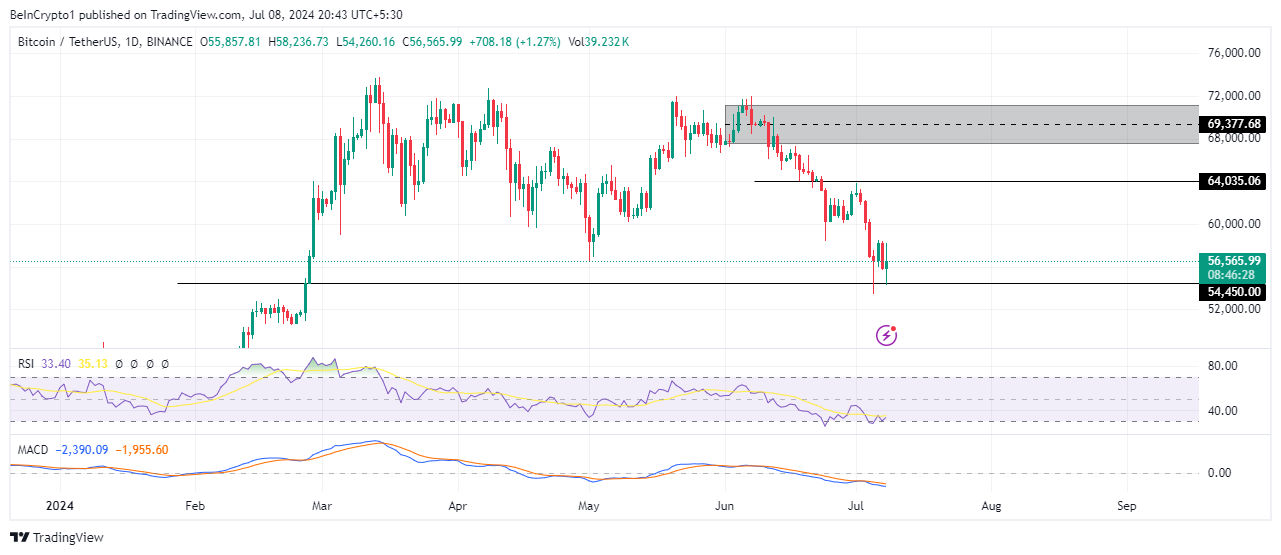 يبدو أن مستوى 54,450 دولار يمثل دعماً محتملاً لسعر البيتكوين. فقد فشلت محاولتا كسر هذا المستوى بعد أن اختبر مؤشر القوة النسبية (RSI) العتبة الحرجة عند 30، مما يشير إلى أن البيتكوين ربما يكون قد وصل إلى القاع.