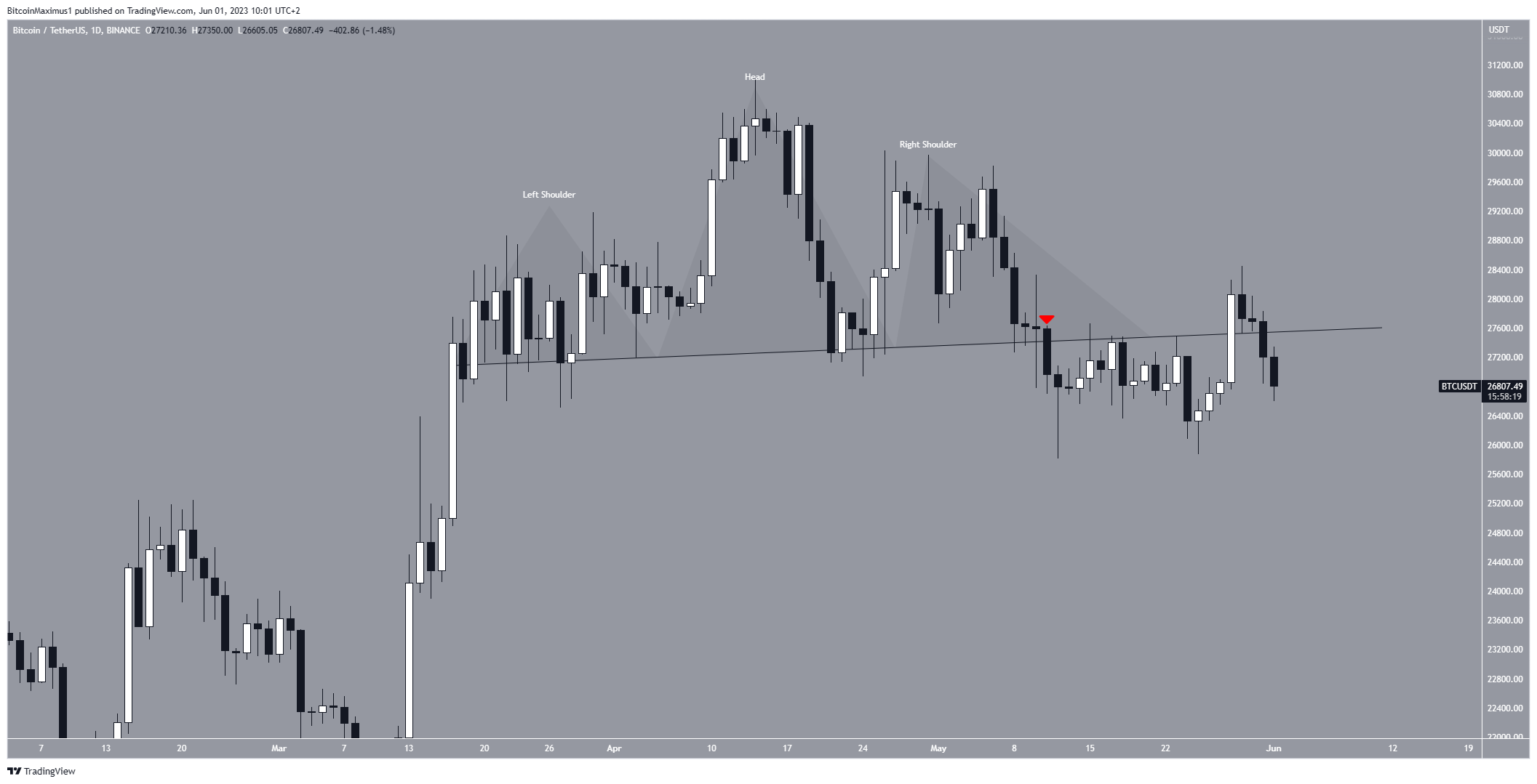 في نفس السياق، أشار متداول التشفير Anbessa100 عبر تغريدته إلى نمط الرأس والكتفين، حيث تدل قراءة النمط على انهيار سعر BTC والانخفاض نحو النطاق السعري 25000 دولار.