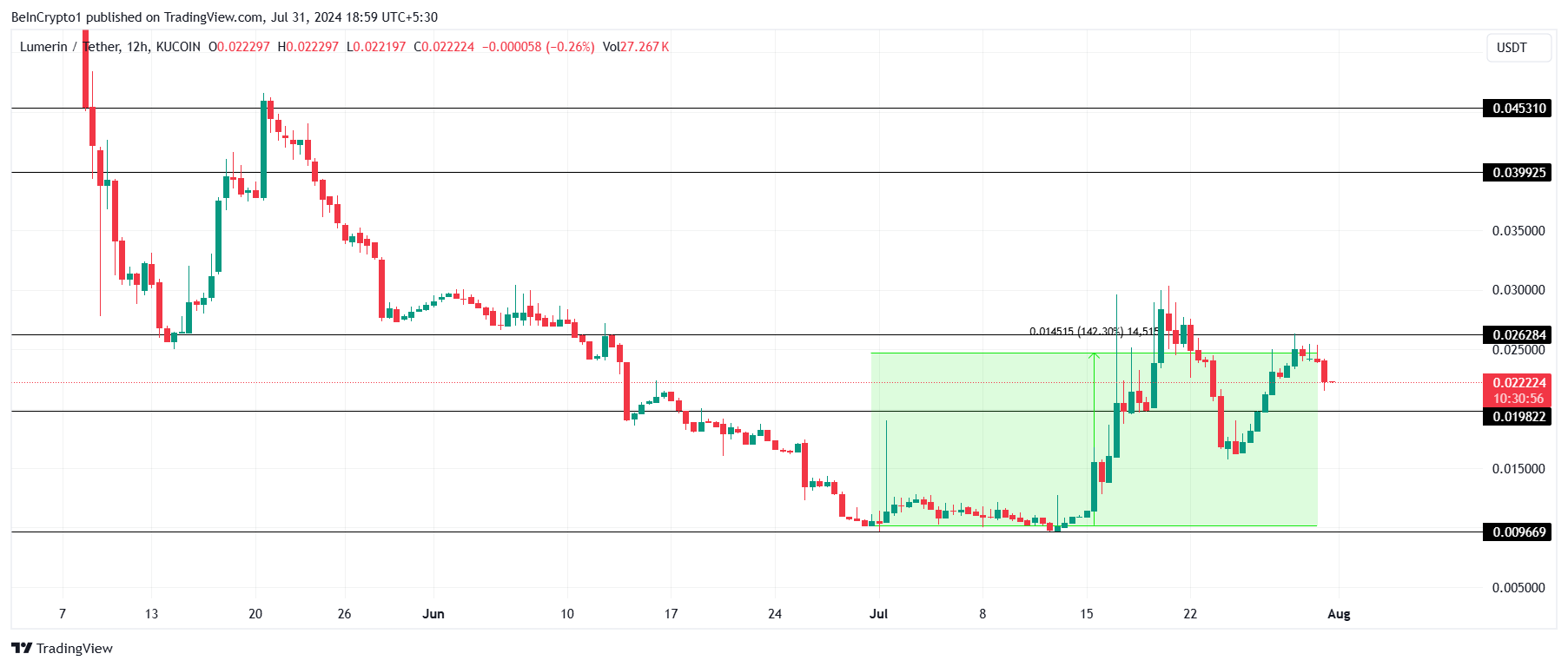 خلال الشهر الماضي، برز لوميرين كواحد من أفضل الأصول الحقيقية أداءً، حيث ارتفع بأكثر من 142%. ونتيجة لذلك، ارتفع سعر لوميرين من 0,009 دولار إلى 0,022 دولار في وقت كتابة هذا التقرير.