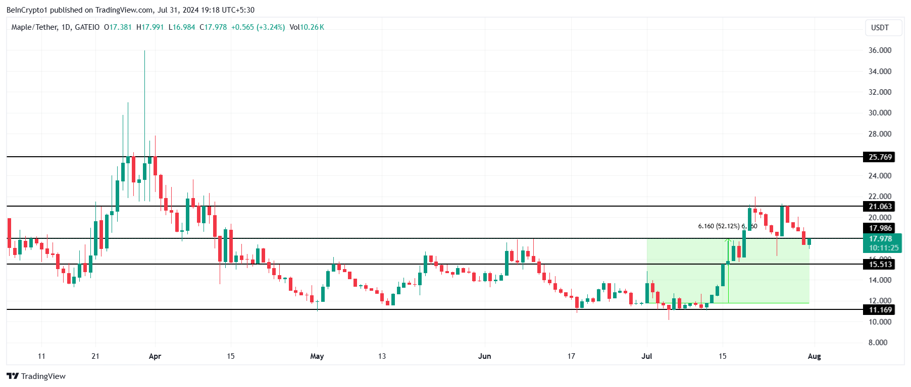 أكبر عائق أمام ارتفاع MPL كان 21,06$. لم يتمكن العملة البديلة من اختراقه مرتين ولم يتمكن من الإغلاق فوقه منذ منتصف أبريل. إذا حدث هذا، فإن سعر Maple قد يكون لديه فرصة للارتفاع إلى 25,76$ واستمرار تجمعه.