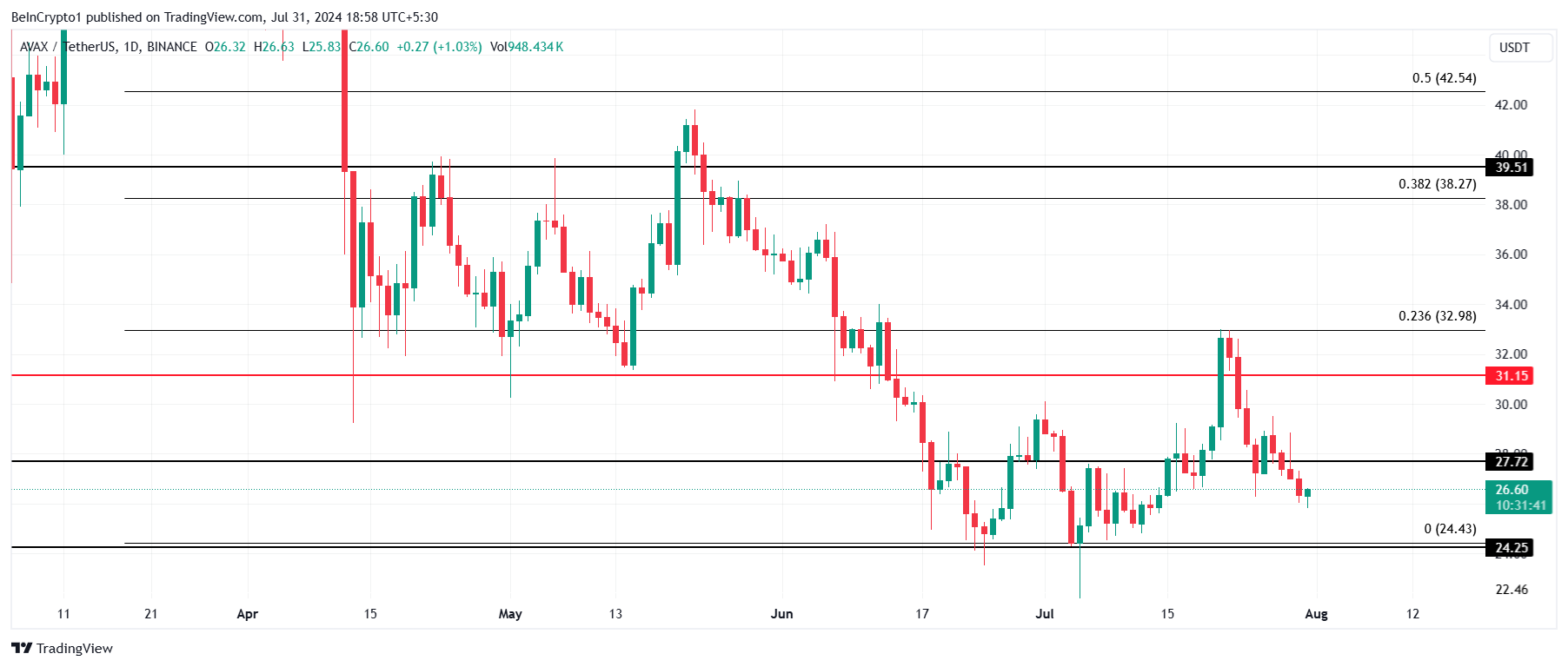 ومع ذلك، فإن الفشل في اختراقه سيستمر في التوطيد الذي يواجهه AVAX، محافظاً على الدعم عند 24,43 دولار. فقدان هذا الدعم سيبطل الفرضية الصعودية.