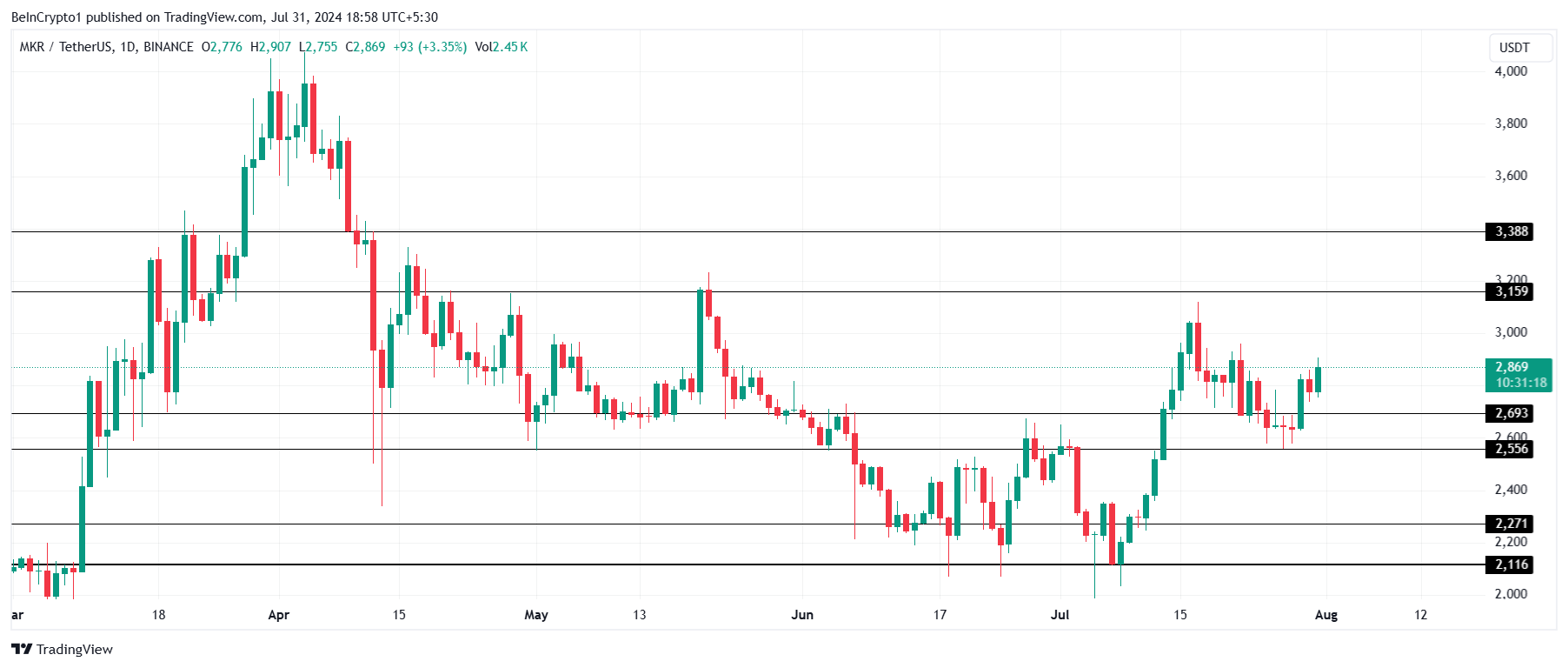 يشمل ذلك أيضاً توسيع إمدادات DAI إلى 100 مليار. من المقرر إطلاقه في صيف 2024، قد يستفيد MKR من هذه الضجة لاختراق المقاومة عند 3,159 دولار وتأمين 3,000 دولار كأرضية دعم. سيمكن ذلك من المزيد من النمو ويتوافق مع حماس مستثمري MKR.