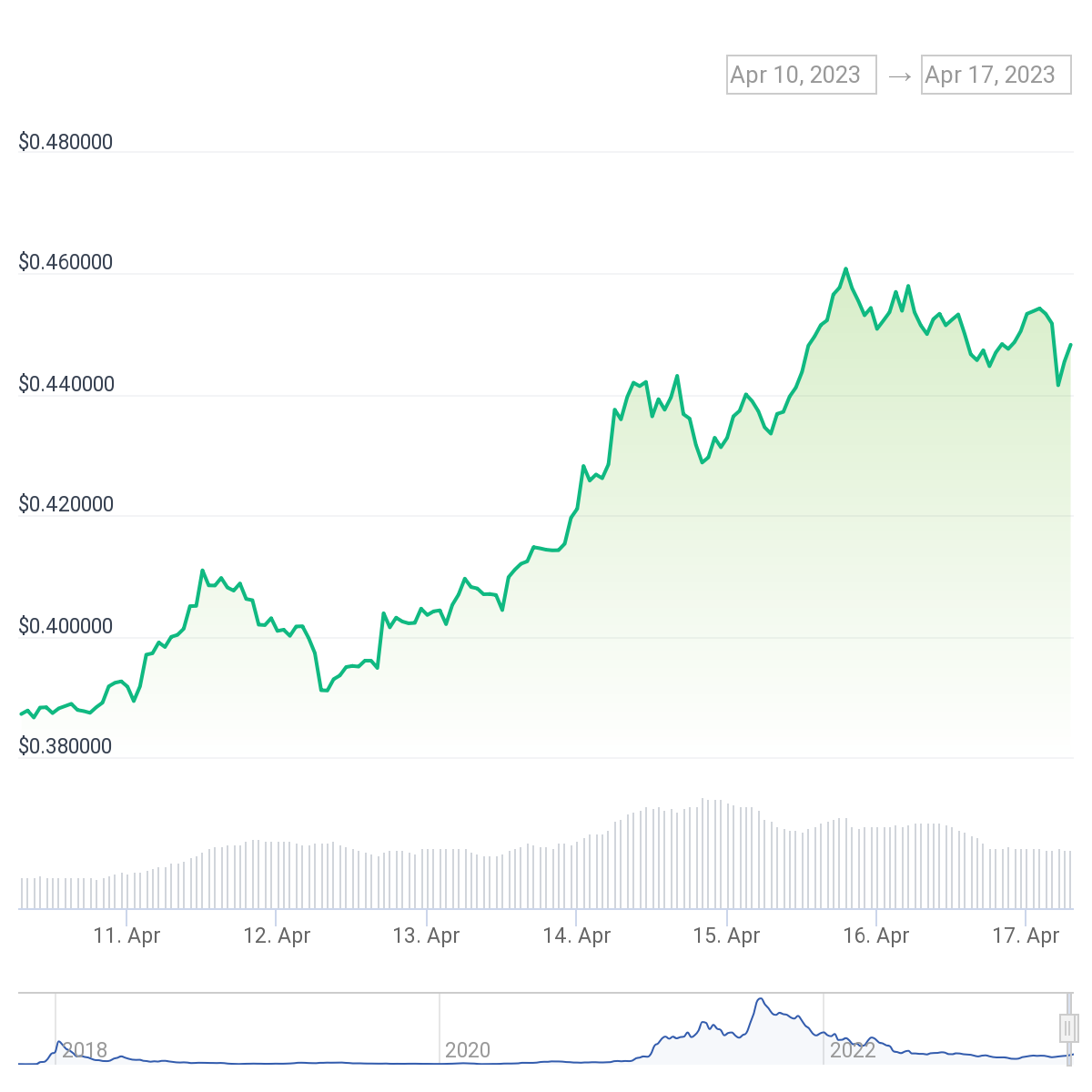 في وقت كتابة هذا التقرير، كان سعر كاردانو ADA يبلغ 0.449 دولار أمريكي، مع حجم تداول يومي وصل إلى 402.89 مليون دولار. ويمثل هذا انخفاضًا في الأسعار بنسبة 0.58٪ في آخر 24 ساعة وزيادة في الأسعار بنسبة 15.13٪ في آخر7 أيام.