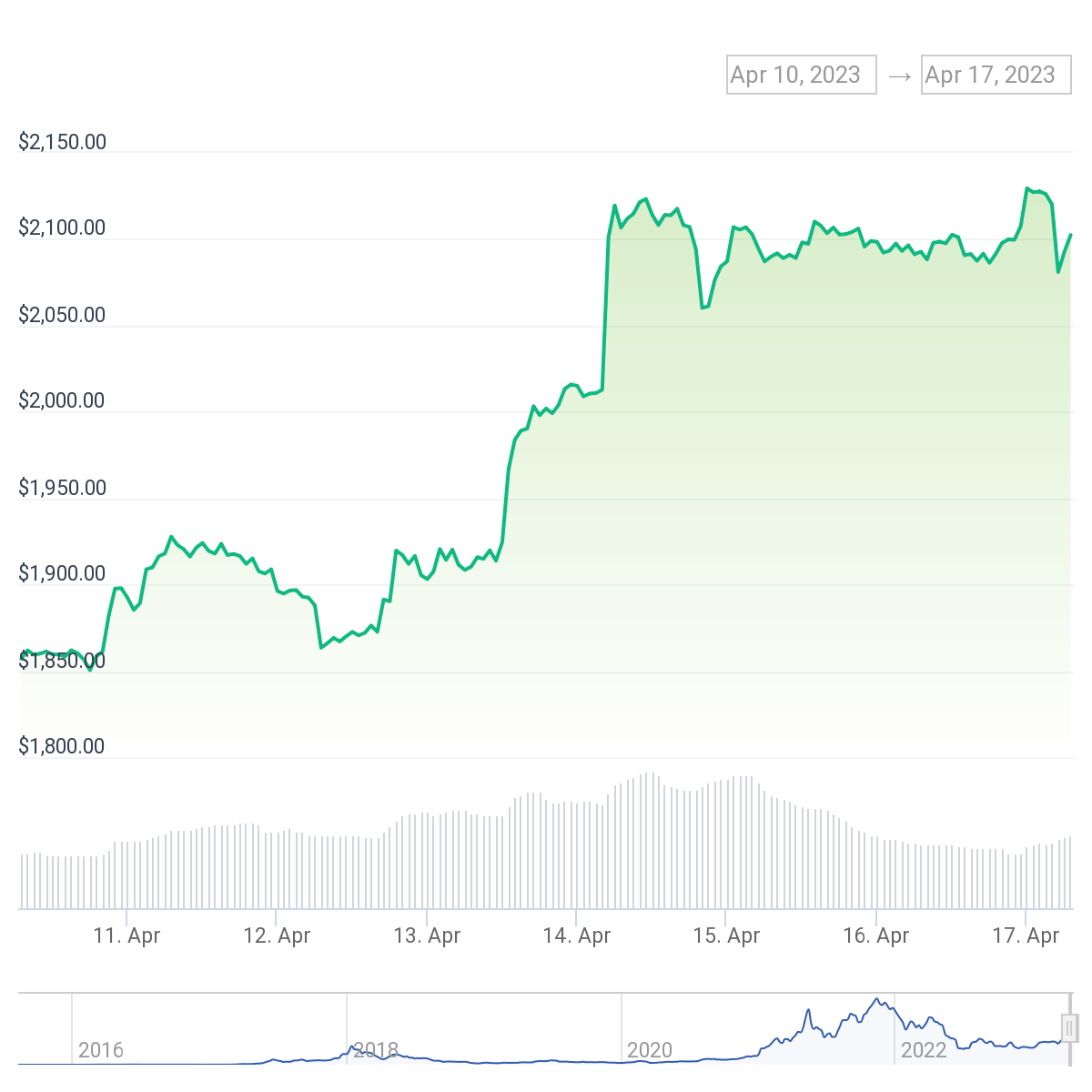 أثناء كتابة هذه المقالة (فجر 17 أبريل) يتم تداول ايثريوم ETH عند 2107 دولار أمريكي مع حجم تداول يومي قدره 9.80 مليار دولار. ويمثل هذا زيادة في الأسعار بنسبة 0.72٪ في آخر 24 ساعة وزيادة في الأسعار بنسبة 13.17٪ في آخر 7 أيام.