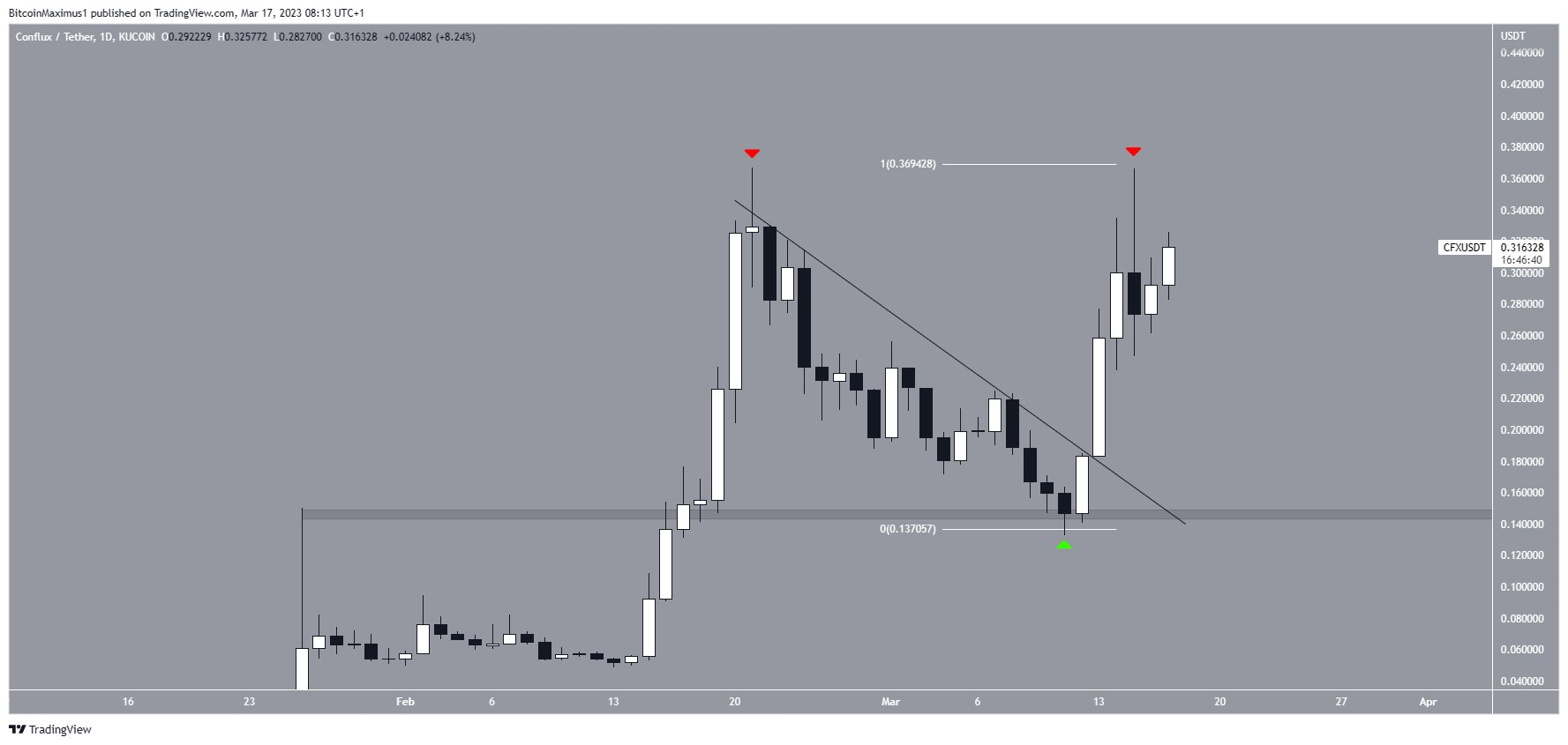 ارتفع سعر عملة CFX منذ ارتداده عند منطقة الدعم الأفقية 0.145 دولار في 11 مارس.