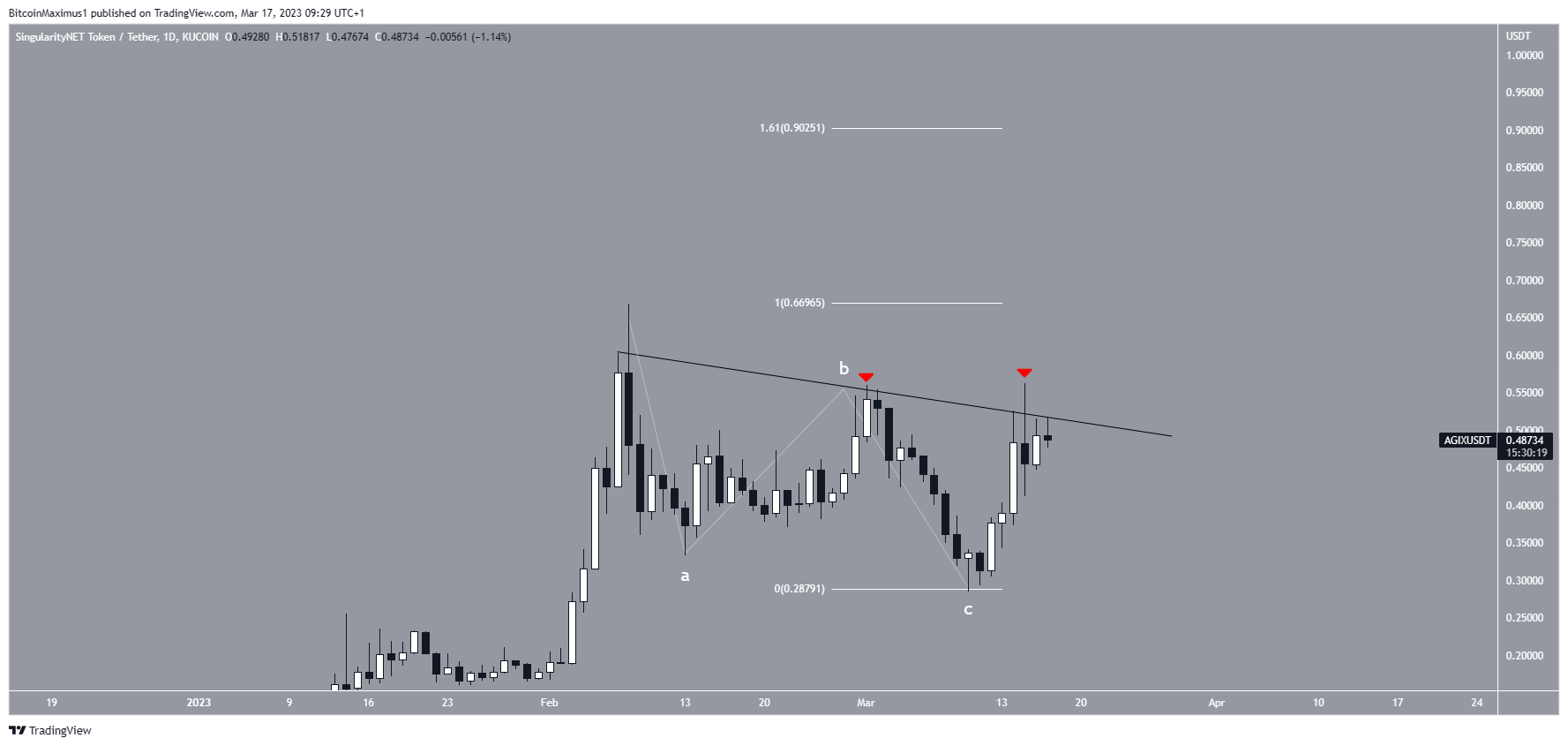 انخفض سعر AGIX تحت خط المقاومة التنازلي منذ 8 فبراير، وتسبب ذلك في حدوث ثلاث حالات من الرفض حتى الوقت الحالي.