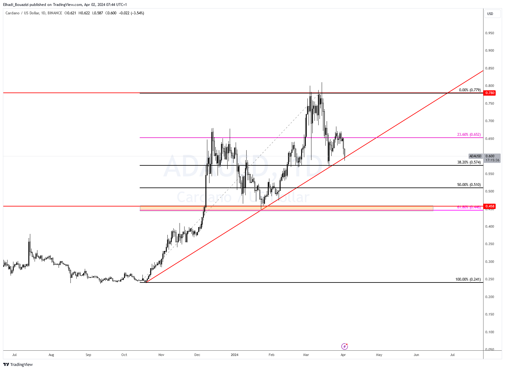 الموجة التصحيحية لعملة كاردانو ADA كانت أقل حدة من العملات الرقمية السابقة الذكر، حيث توقفت عند مستوى فيبوناتشي 38.2 عند سعر 0.570 دولار. أين لامس السعر أيضا خط الاتجاه الصاعد الذي بدا أكتوبر من العام الماضي.