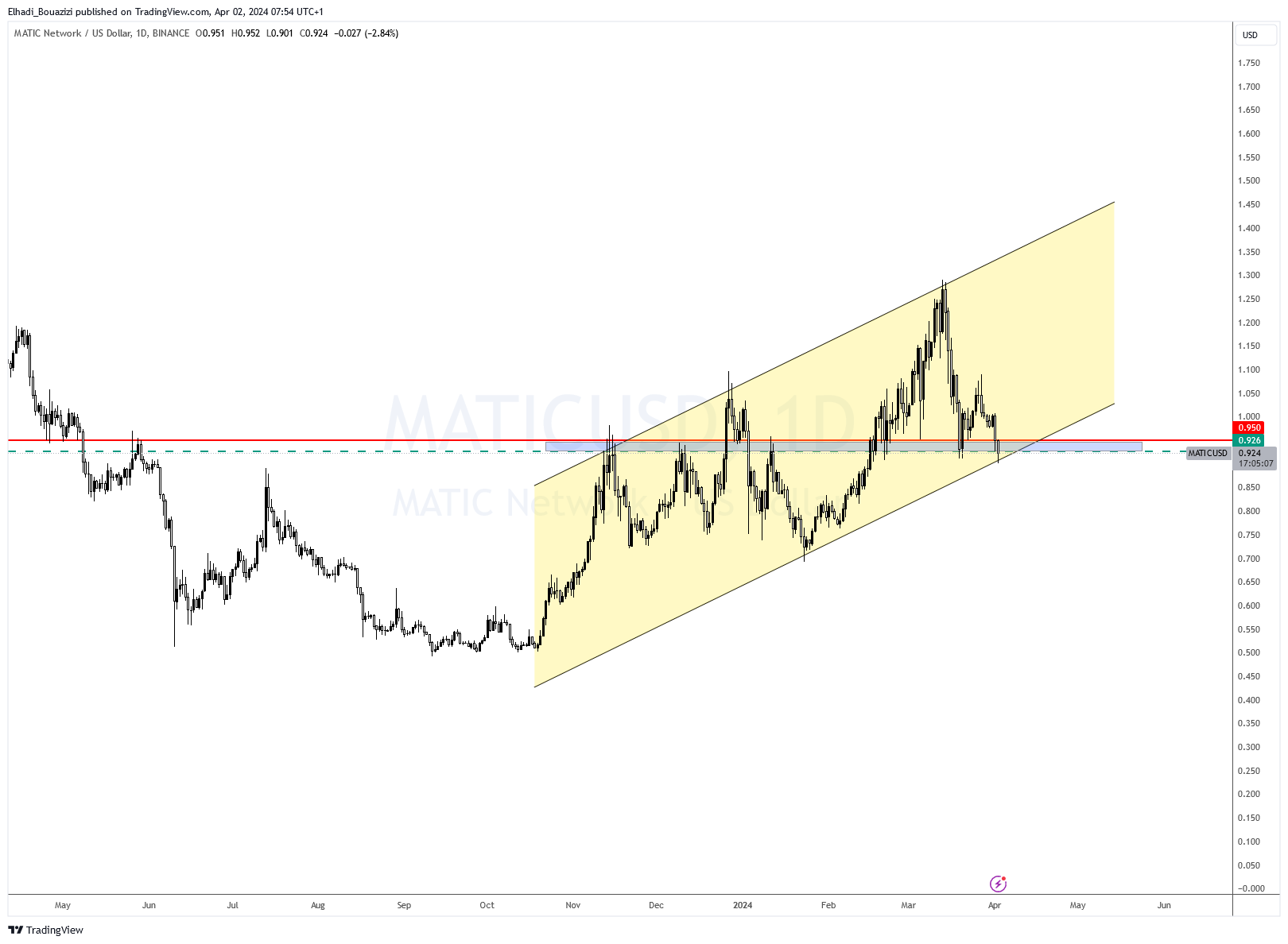 يتحرك سعر عملة بوليجون MATIC في قناة سعرية صاعدة على الرسم البياني اليومي. وهو الآن يختبر الحد العلوي لهذه القناة في منطقة قمم و قيعان سابقة. ما يجعلها منطقة دعم قوية قد تكون مناسبة للشراء.