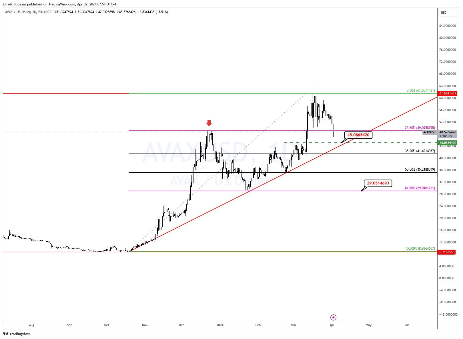 يتحرك سعر عملة AVAX في خط اتجاه صاعد على الرسم البياني اليومي، مع احترام واضح لمستويات فيبوناتشي. السعر الآن يتداول عند القمة السابقة 49 دولار و التي تتطابق مع مستوى تصحيح فيبوناتشي 23.6%.