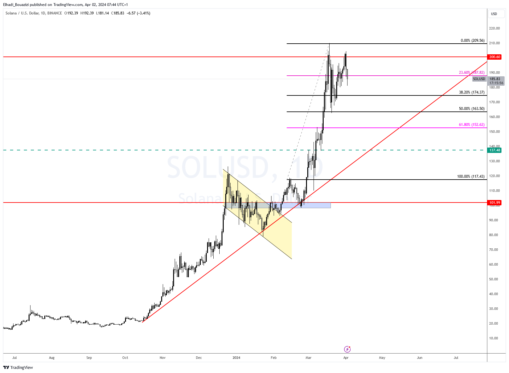 بعد الارتداد من الموجة الهابطة السابقة التي توقفت عند مستوى فيبوناتشي 50% عند سعر 160 دولار. عاد سعر SOL لاختبار قمة 205 دولار.