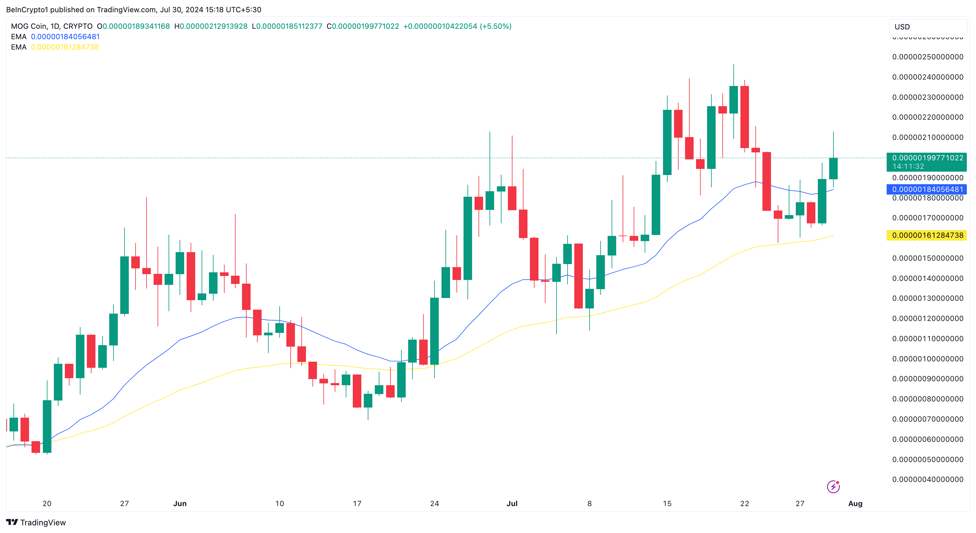 حاليًا، العملة الميمية منخفضة بنسبة 17% من ATH لكنها زادت بنسبة 6,98% في آخر 24 ساعة. ومع ذلك، يظهر المتوسط المتحرك الأسي (EMA) أن سعر MOG قد يستمر في القفز في أغسطس.