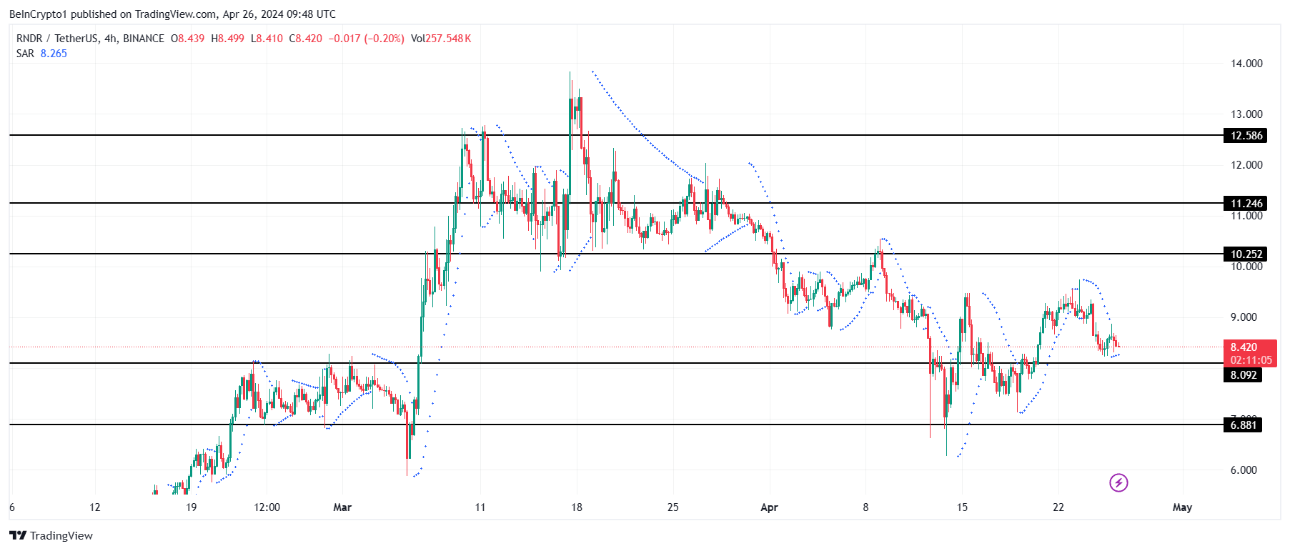 ومع ذلك ، فإن فقدان دعم 8.0 دولار سيزيد سعر RNDR إلى 6.8 دولار. قد يؤدي السقوط من خلاله إلى القضاء على إمكانات النتيجة الصعودية.