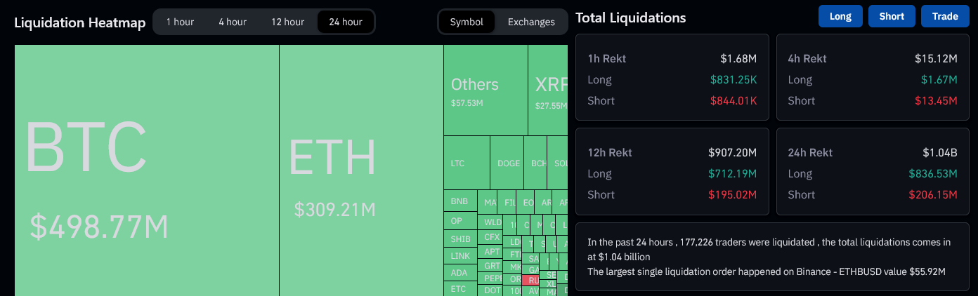 Sponsoredالقيمة الإجمالية لهذه التصفيات بلغت 1.04 مليار دولار خلال 24 ساعة الماضية. 835 مليون دولار كانت صفقات شراء للمتداولين الذين راهنوا على ارتفاع الأسعار (تؤدي إلى مزيد من الانخفاض في السعر).