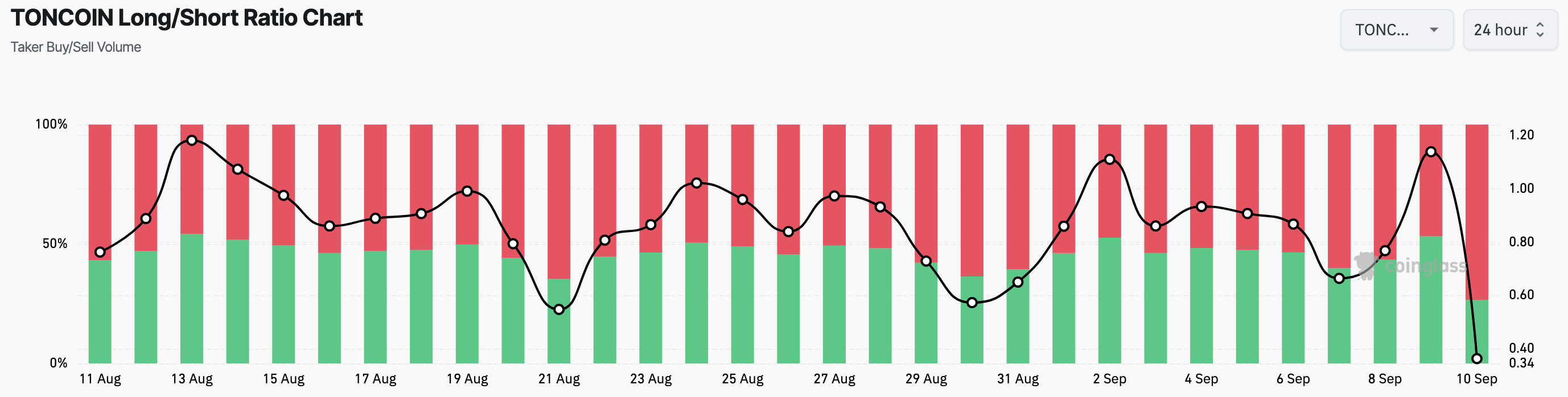 ومع ذلك، وحتى كتابة هذه السطور، انخفضت نسبة الطويل/القصير إلى 0,36، مما يظهر أن حوالي 73% من المتداولين قرروا القيام ببيع الرمز على الرغم من الاتجاه الصعودي. من ناحية أخرى، 26% لا يزالون يعتقدون أن سعر TON سيرتفع حيث اختاروا مراكز طويلة.