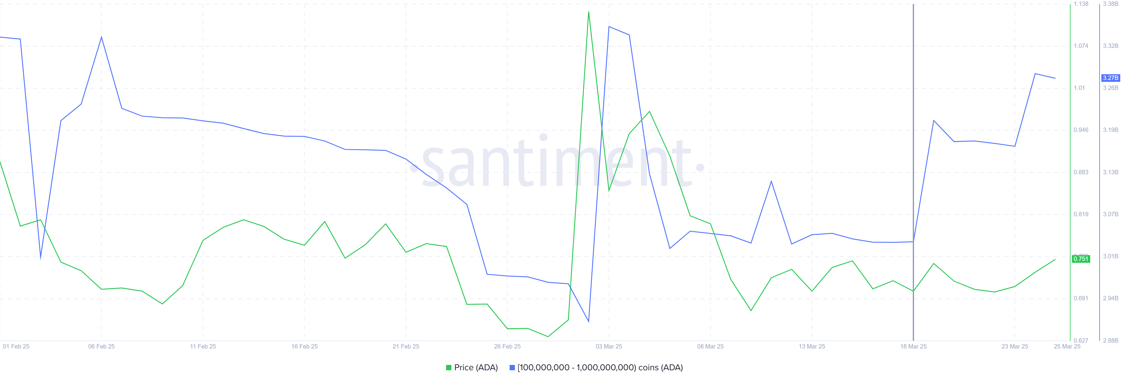 عناوين الحيتان كانت تجمع ADA بنشاط عند الأسعار المنخفضة الحالية، مما يشير إلى الثقة في انتعاش محتمل. خلال الأسبوع الماضي، أضافت العناوين التي تحتفظ بين 100 مليون و1 مليار ADA أكثر من 240 مليون ADA، بقيمة تزيد عن $175 مليون. هذا التجميع الكبير من قبل الحيتان يشير إلى إيمانهم بـ القيمة طويلة الأجل لكاردانو واحتمالية زيادة السعر.
