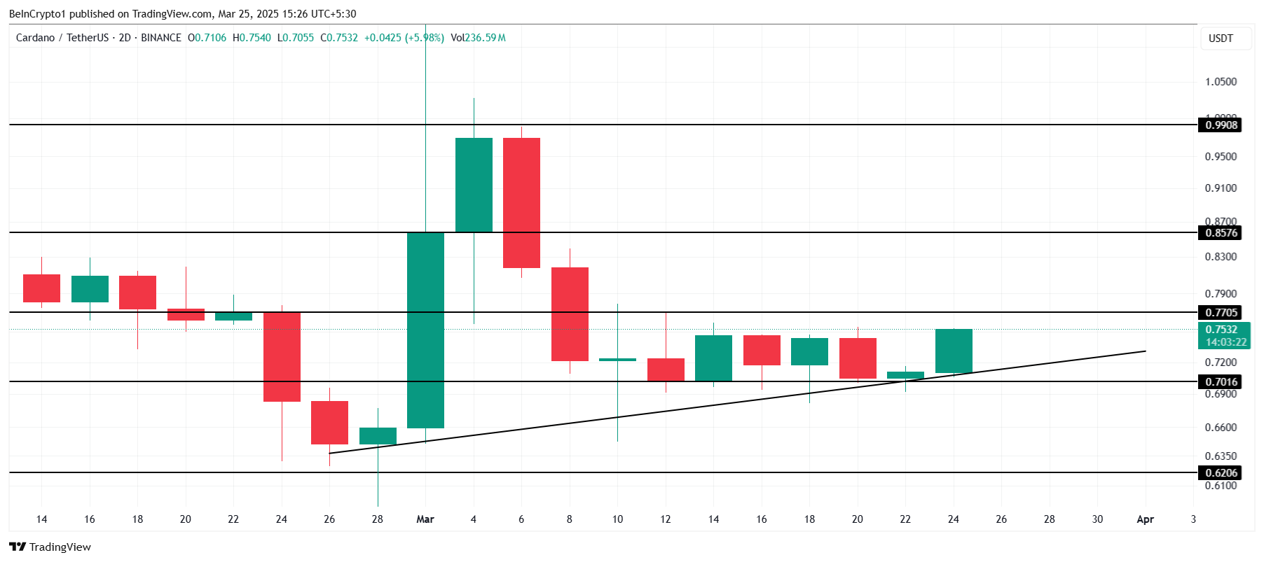 ومع ذلك، إذا فشل كاردانو في اختراق حاجز $0,77، فمن المحتمل أن يستمر في التماسك فوق دعم $0,70. في هذه الحالة، سيظل ADA عرضة لانخفاض محتمل إلى $0,62، مما قد يمدد مرحلة التماسك ويؤخر أي تعافي كبير.