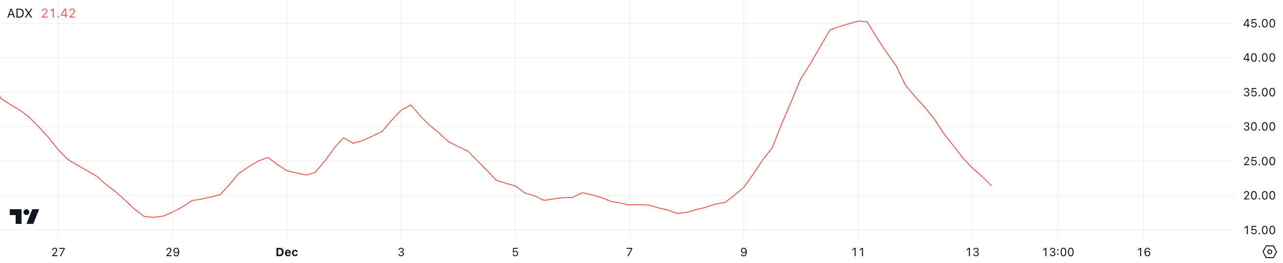 بين 7 ديسمبر و10 ديسمبر، شهد سعر ADA تصحيحًا حادًا، حيث انخفض بنسبة 23% مع ارتفاع مؤشر الاتجاه المتوسط (ADX) إلى 45، مما يشير إلى اتجاه هبوطي قوي.