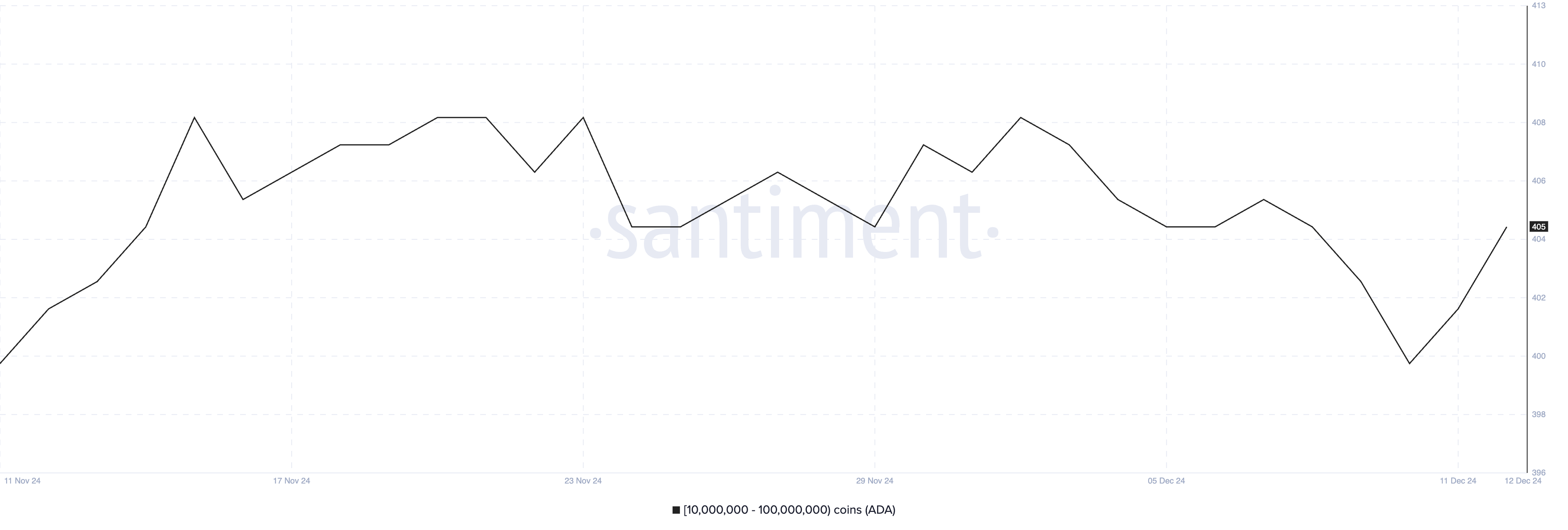 بين 7 ديسمبر و10 ديسمبر، انخفض عدد المحافظ التي تحتوي على ما بين 10 مليون و100 مليون ADA بشكل حاد من 406 إلى 400، مسجلًا أدنى مستوى منذ 11 نوفمبر.