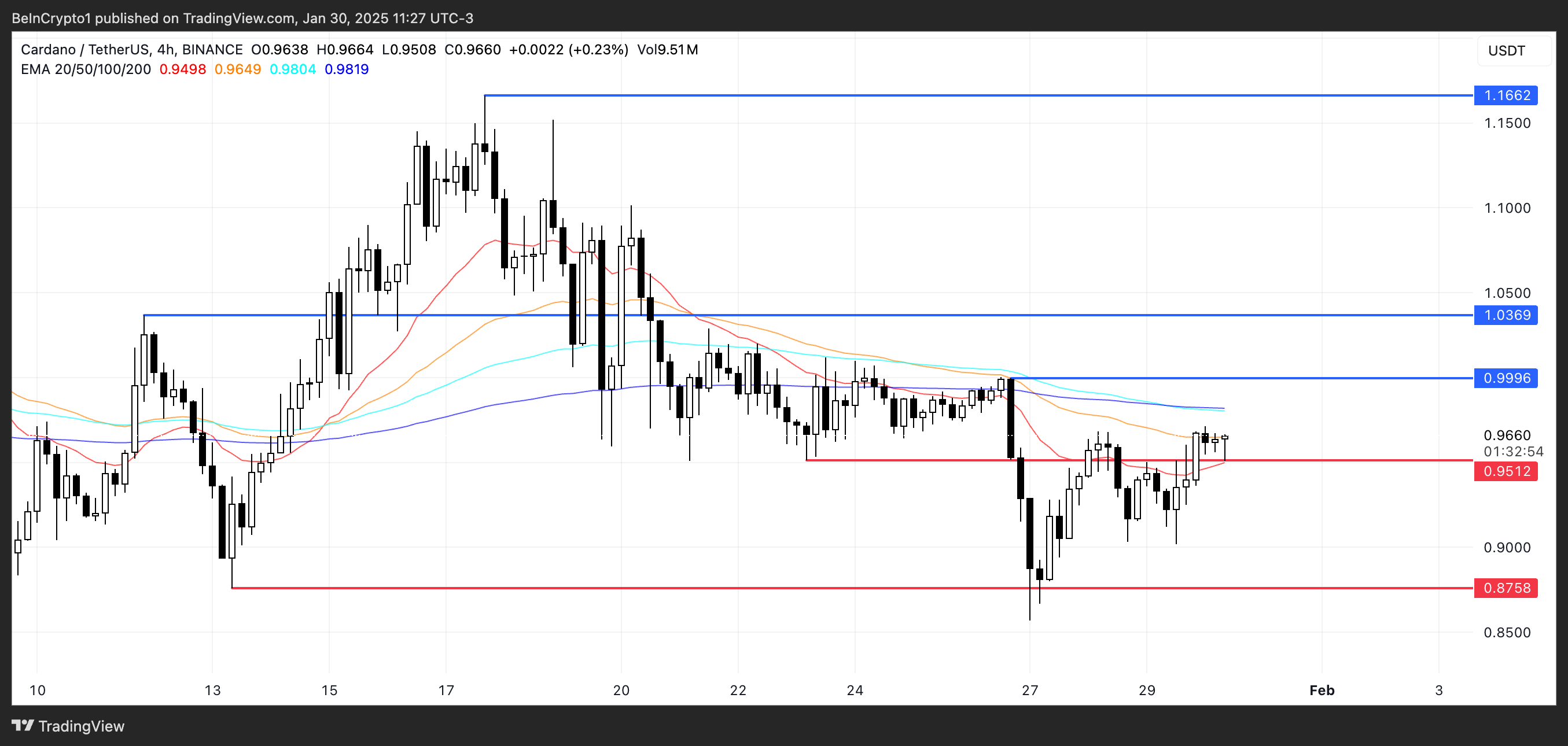 ومع ذلك، تشير خطوط EMA إلى أن تقاطعًا ذهبيًا قد يتشكل قريبًا، مما سيشير إلى تعزيز الزخم الصعودي. إذا حدث هذا التقاطع، فقد يختبر سعر ADA مقاومة $0,99، مما قد يدفعه إلى $1,03، بزيادة محتملة بنسبة 20%.
