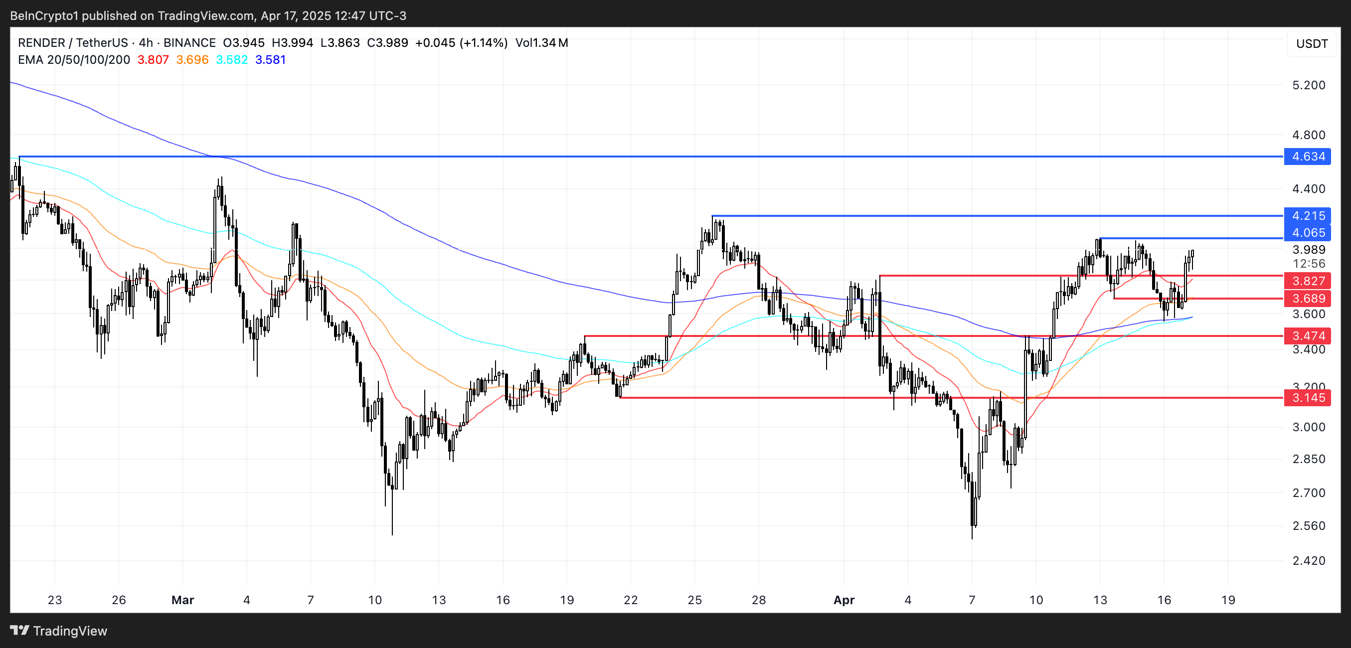 إذا استمر الزخم الصعودي، قد يختبر RENDER مستويات المقاومة عند 4,065$ و4,21$، وقد يفتح الاختراق الطريق إلى 4,63$.