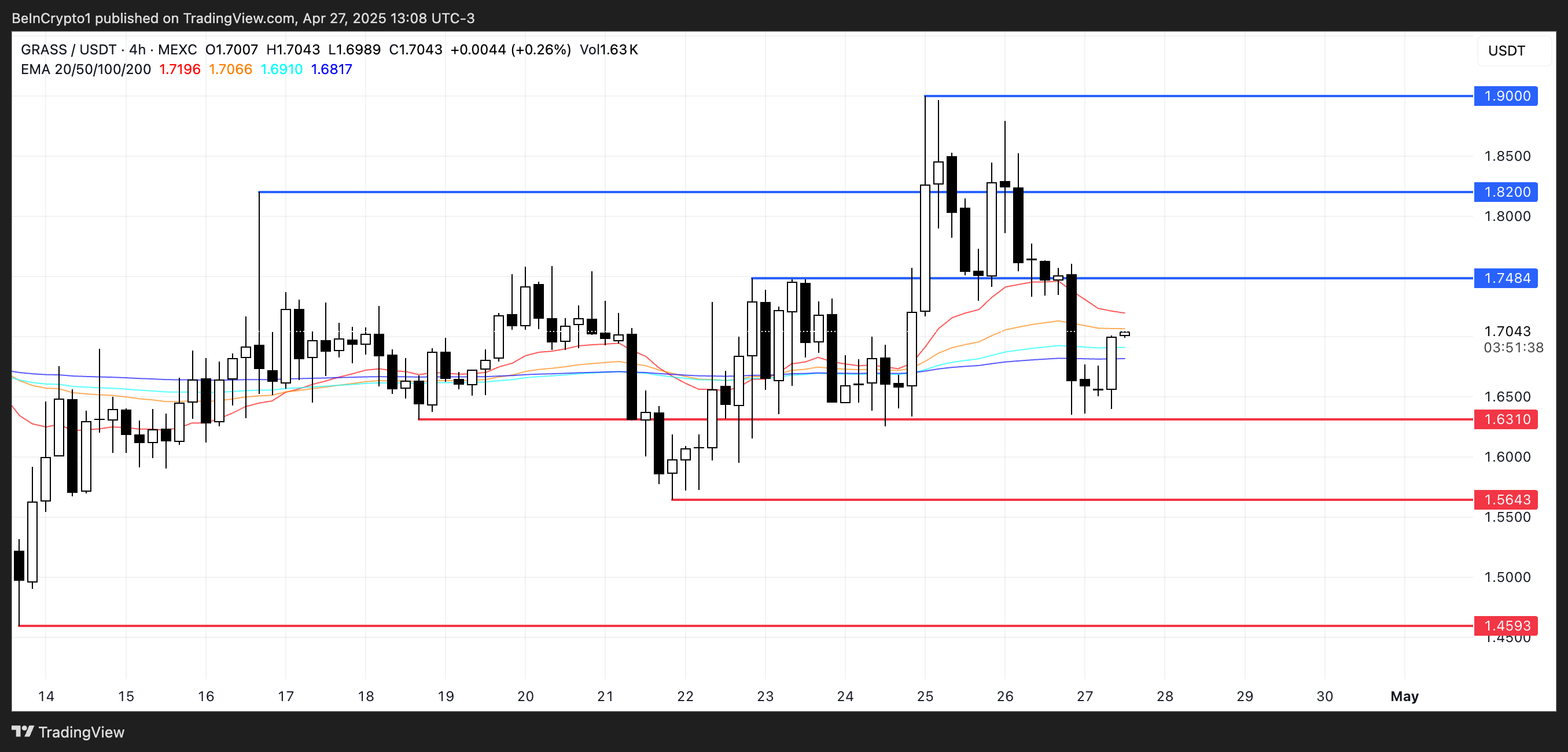 إذا زادت ضغوط البيع، فقد يختبر GRASS الدعم عند $1,63؛ فقدان هذا المستوى قد يؤدي إلى مزيد من الانخفاضات نحو $1,56 وحتى $1,45.