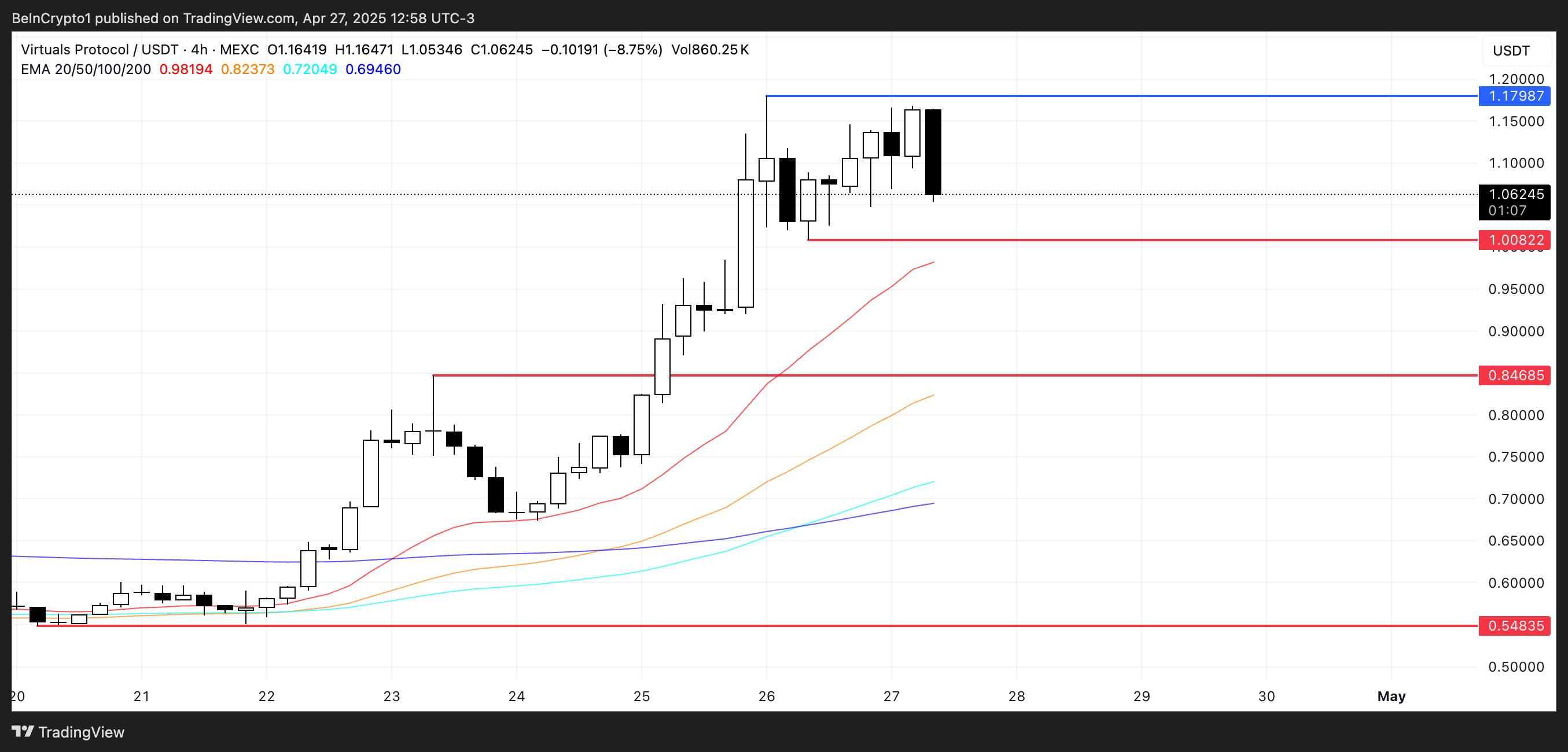 ومع ذلك، إذا تمكن VIRTUAL من الحفاظ على زخمه الإيجابي، فقد يرتفع نحو المقاومة عند $1,17.