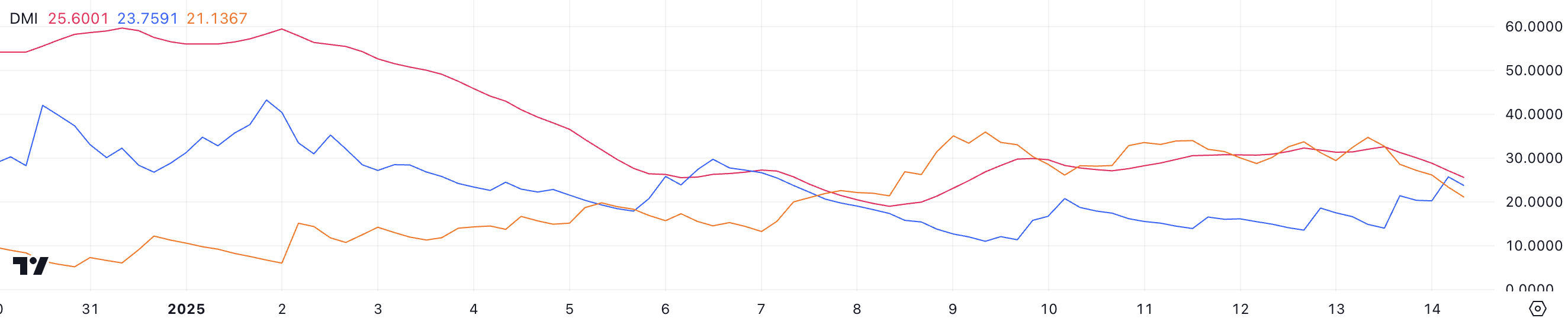 يقيس مؤشر ADX، أو مؤشر الاتجاه المتوسط، قوة الاتجاه دون الإشارة إلى اتجاهه. تشير القيم أقل من 20 إلى اتجاه ضعيف أو غير موجود، بينما تشير القيم فوق 25 إلى اتجاه قوي. في حالة AI16Z، ارتفع +DI، الذي يمثل الضغط الصعودي، من 14 إلى 23,7، مما يعكس زيادة في زخم الشراء حيث تحاول عملات الذكاء الاصطناعي التعافي من التصحيحات القوية الأخيرة.