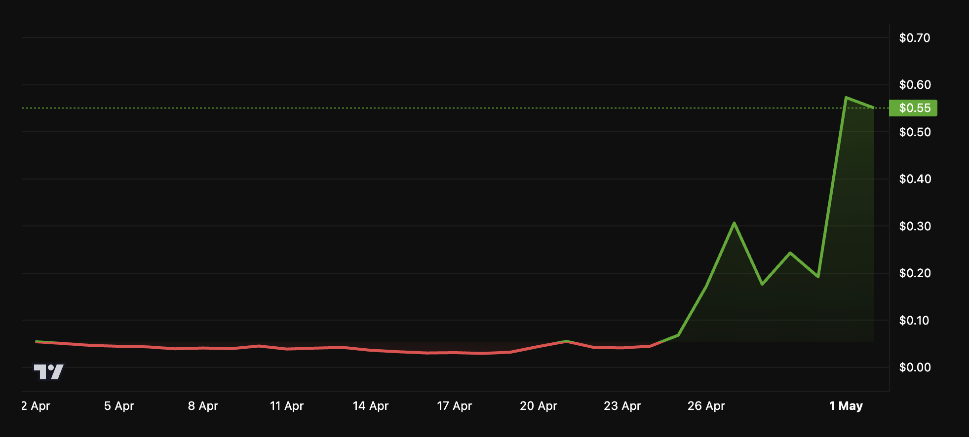ومع ذلك، يبدو أن الزخم قد تباطأ بعض الشيء مع اقتراب ALPACA من إزالة الإدراج في 2 مايو. خلال اليوم الماضي، انخفضت قيمته بنسبة 34,5%. في وقت كتابة هذا التقرير، كان يتم تداوله عند $0,55.