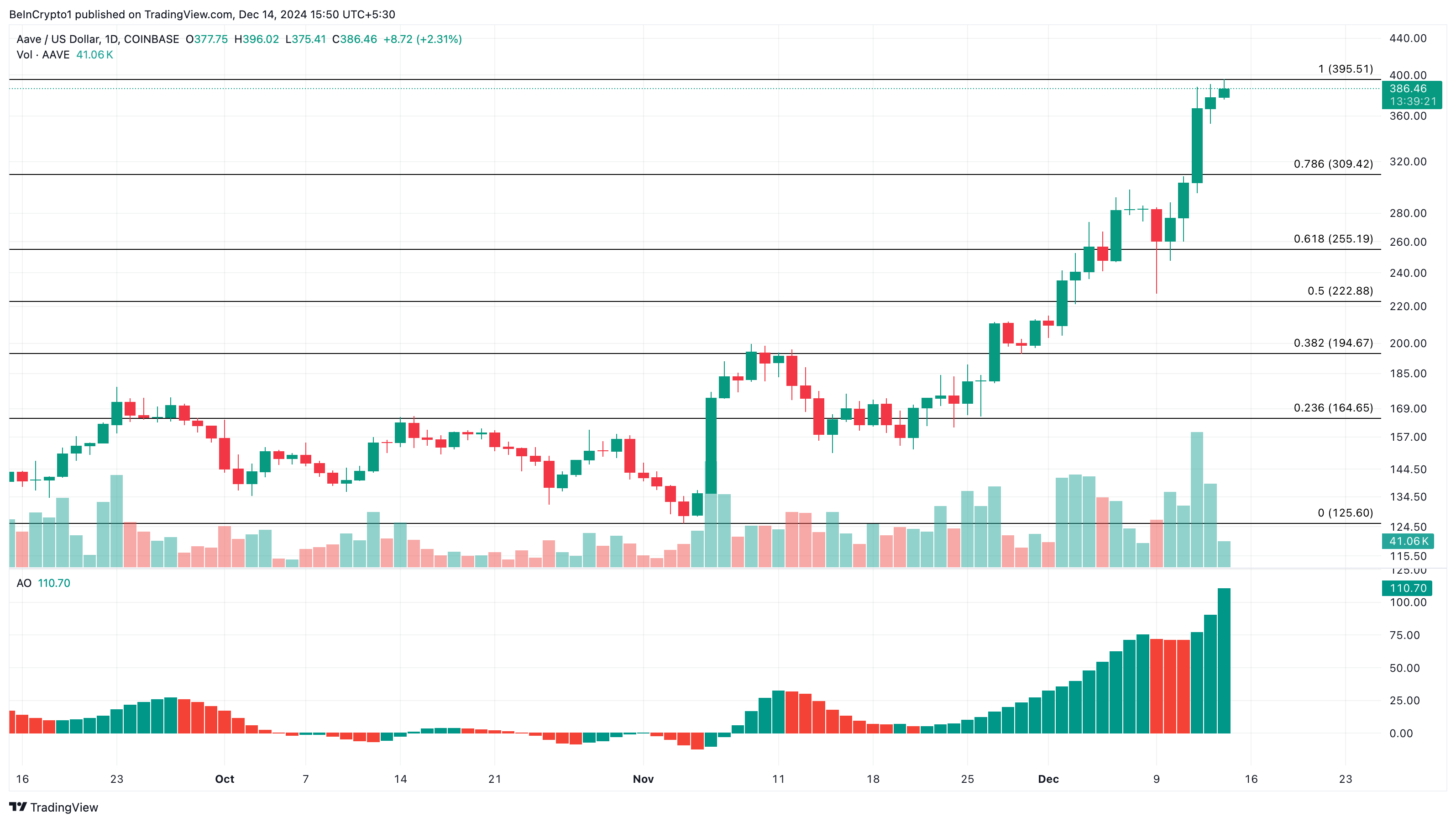 لا يبدو على الرسم البياني اليومي أن ارتفاع AAVE سيتراجع قريبًا. أحد أسباب هذا التأكيد هو مؤشر Awesome Oscillator (AO)، وهو مؤشر يقيس الزخم.