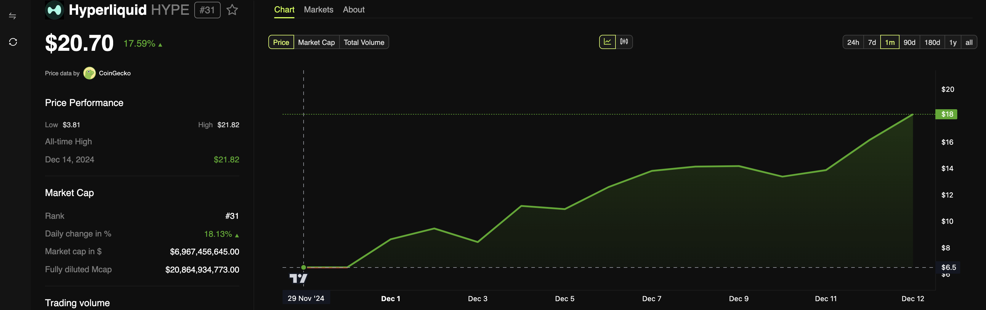 تتصدر قائمة العملات الرقمية البديلة الرابحة في ديسمبر HYPE، الرمز الأصلي لبورصة هايبيرليكود اللامركزية الدائمة. هذا الأسبوع، ارتفع سعر HYPE بنسبة 48,60% وبلغ أعلى مستوى له على الإطلاق عند 21,48$ قبل أن يتراجع مؤخرًا إلى 20,70$.