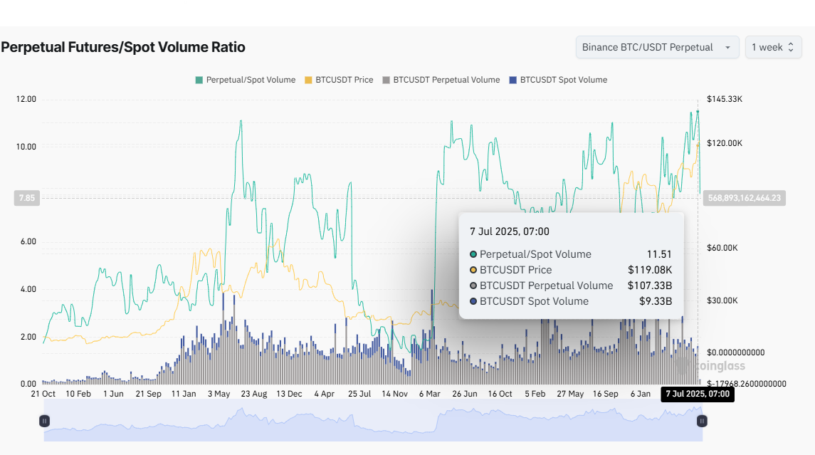 وفقًا لـ Coinglass، كان حجم تداول العقود الآجلة لـ بيتكوين الأسبوع الماضي أكثر من 10 مرات من حجم تداولها الفوري. وصل نسبة حجم العقود الآجلة الدائمة/الفوري إلى 11,5، وهو الأعلى في التاريخ.