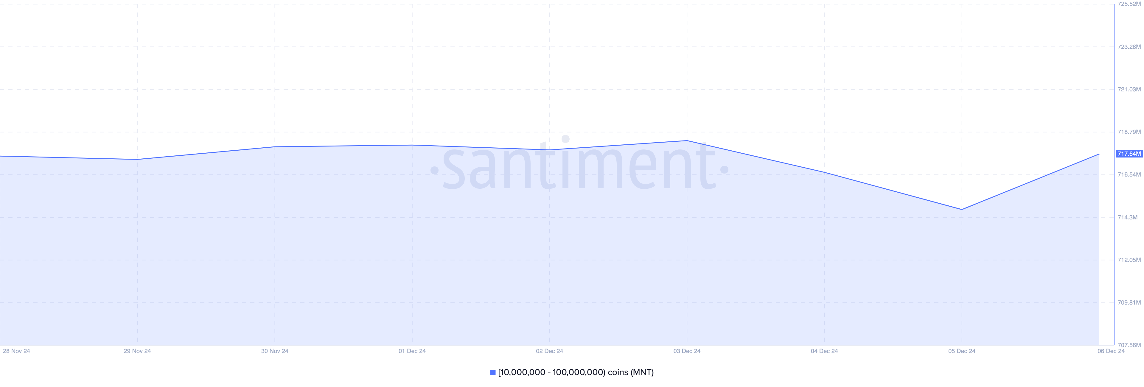 وفقًا لـ Santiment: زادت عناوين Mantle التي تحتفظ بـ 10 ملايين إلى 100 مليون رمز من رصيدها بأكثر من 4 ملايين دولار هذا الأسبوع. وبالتالي، إذا استمر رصيد هذه العناوين في الارتفاع، فسيرتفع سعر MNT أيضًا. من ناحية أخرى، قد يؤدي انخفاض في ممتلكاتهم إلى سحب السعر إلى الأسفل.