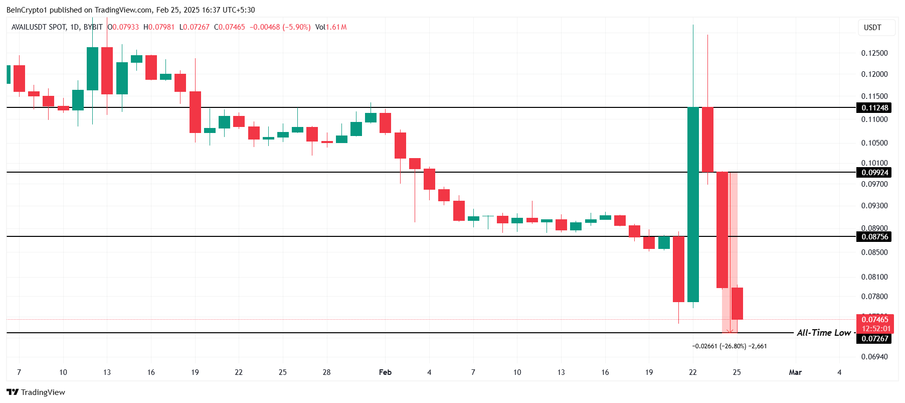 انخفض سعر AVAIL بنسبة 26,8% خلال اليوم الماضي، ليصل إلى أدنى مستوى جديد على الإطلاق عند 0٬072 دولار. وهذا يمثل ثاني أدنى مستوى على الإطلاق في غضون سبعة أيام فقط. يعكس الاتجاه الهبوطي المستمر صراعًا للعملة البديلة، ويواجه مستثمروها خسائر كبيرة في ظل ظروف السوق الحالية.