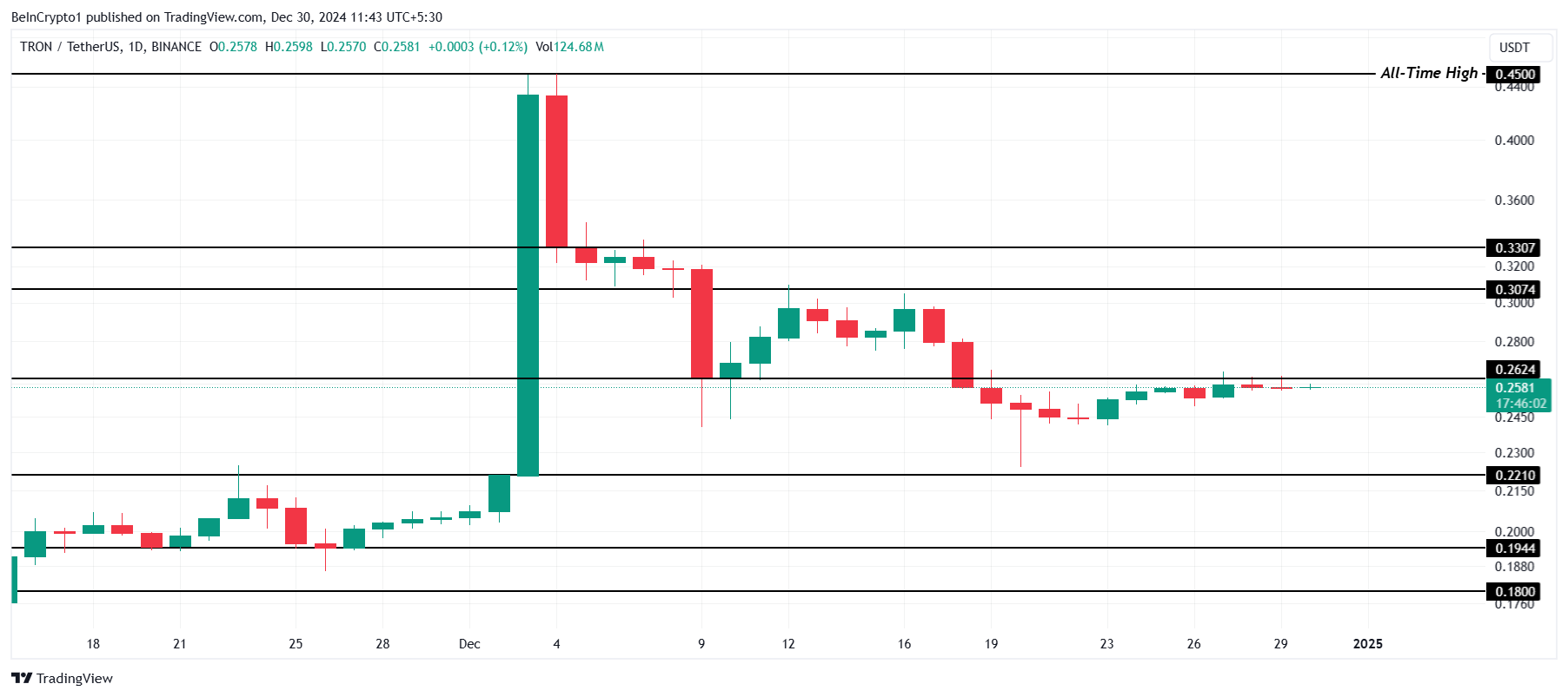 يتداول سعر ترون عند 0,25 دولار، يكافح لاختراق حاجز المقاومة عند 0,26 دولار. تستعد شبكة ترون لترقية محورية حيث تدمج بيانات تشينلينك، مما يجعل تشينلينك الحل الرسمي للأوراكل، وهي خطوة من المتوقع أن تعزز من وظائف الشبكة.