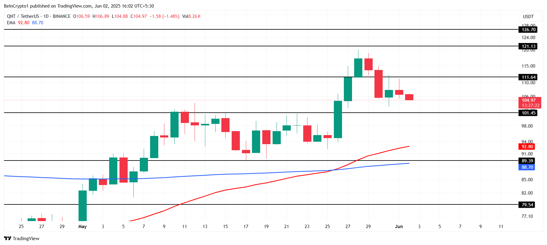 يشير ظهور تقاطع ذهبي، مع عبور المتوسط المتحرك الأسي لـ50 يومًا فوق المتوسط المتحرك الأسي لـ200 يوم، إلى أن QNT يمكن أن تدفع نحو $111. تحويل هذا المقاومة بنجاح إلى دعم سيؤكد الاتجاه الإيجابي للعملة البديلة و يجذب اهتمام شراء إضافي.