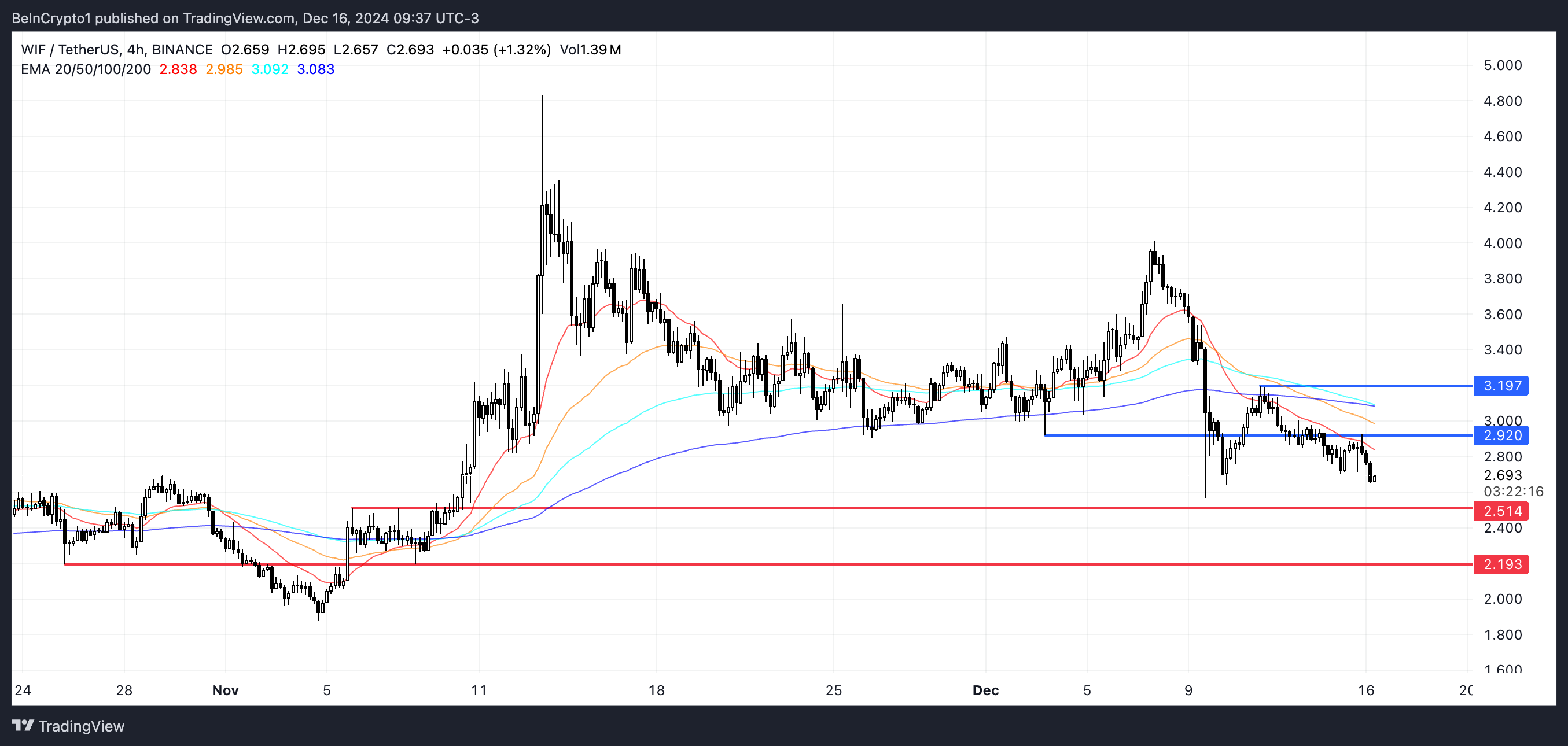 سعر WIF انخفض بحوالي 20% في الأسبوع الماضي، ليهبط تحت عتبة القيمة السوقية البالغة 3 مليارات دولار والآن يجلس عند 2,65 مليار دولار. يعكس هذا الانخفاض ضغطًا هبوطيًا كبيرًا، مما يسحب WIF إلى أدنى مستوياته منذ منتصف نوفمبر.