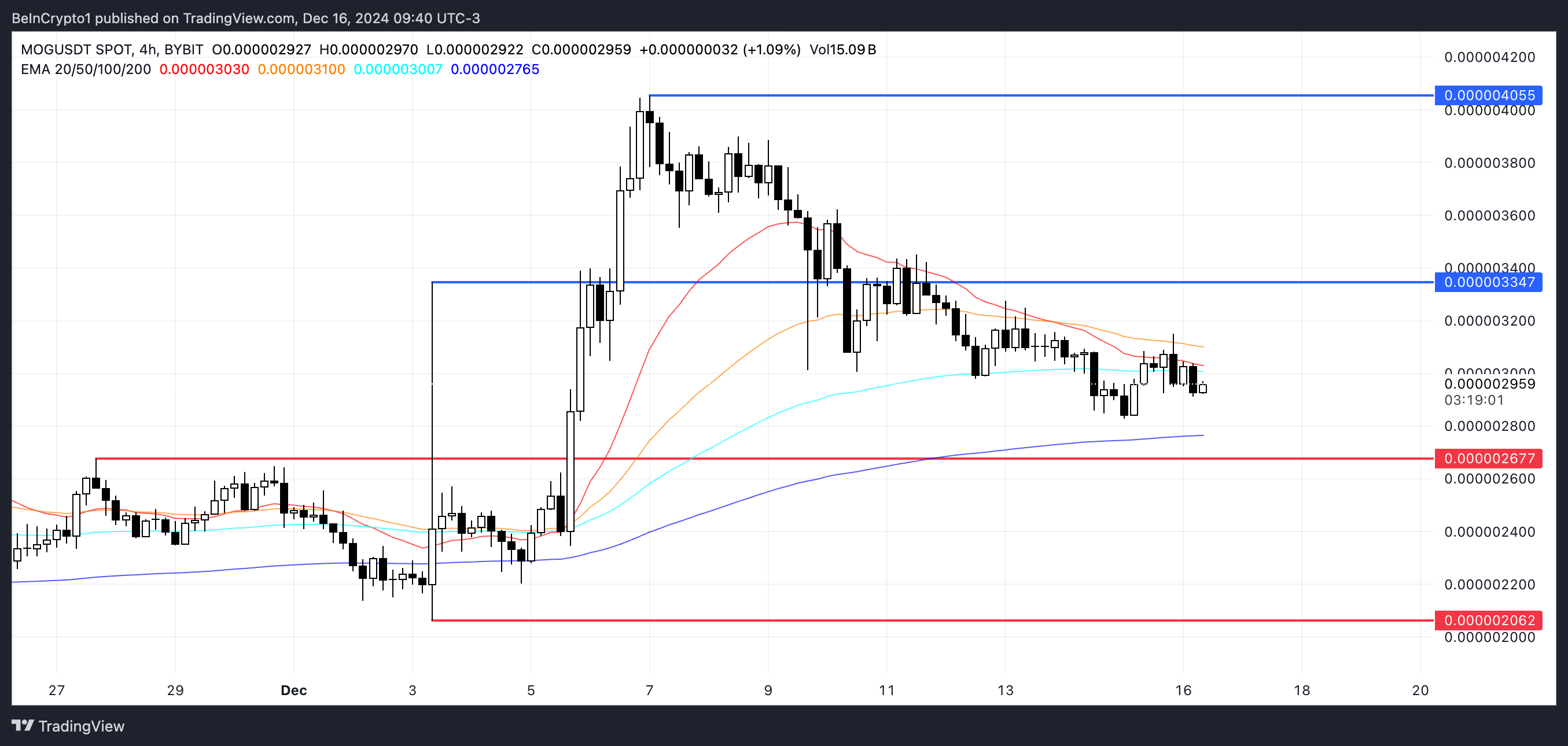 إذا تشكل تقاطع الموت، يمكن أن يختبر MOG الدعم عند $0,00000267 وربما ينخفض أكثر إلى $0,0000020. ومع ذلك، يمكن أن يشهد انعكاس الاتجاه تحدي المقاومة عند $0,0000033.
