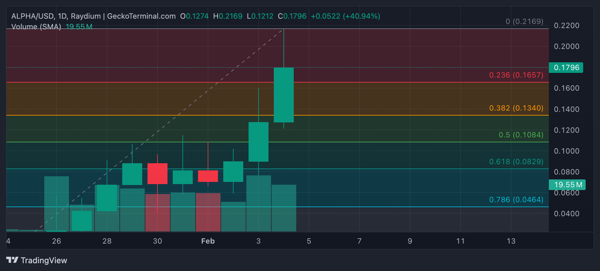 أدى ارتفاع سعر ALPHA بنسبة 87% إلى جعله عملة بديلة رائجة اليوم. خلال جلسة التداول المبكرة اليوم، تم تداول الرمز لفترة وجيزة عند أعلى مستوى له على الإطلاق وهو 0,21$. بينما تراجعت قيمته منذ ذلك الحين بنسبة 9%، يشير حجم التداول اليومي المرتفع إلى أن نشاط الشراء لا يزال جاريًا.