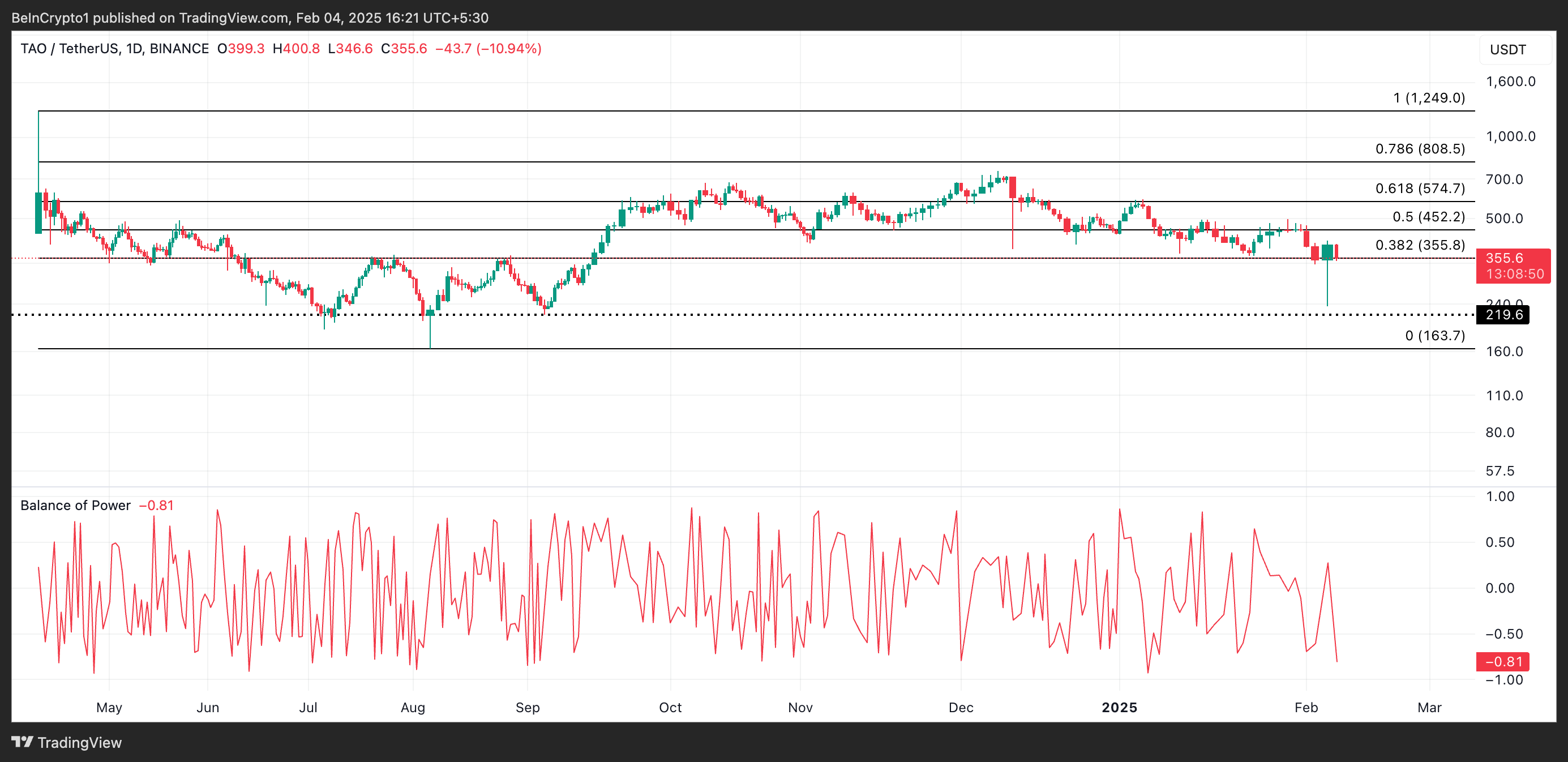 على سبيل المثال، على الرغم من ارتفاع TAO، يظل توازن القوة (BoP) أقل من الصفر عند -0,81. يقيس BoP قوة المشترين مقابل البائعين من خلال مقارنة سعر الإغلاق بنطاق السعر خلال فترة معينة. عندما يكون سالبًا، فإنه يشير إلى أن ضغط البيع هو المسيطر، مما يشير إلى شعور هبوطي في السوق.