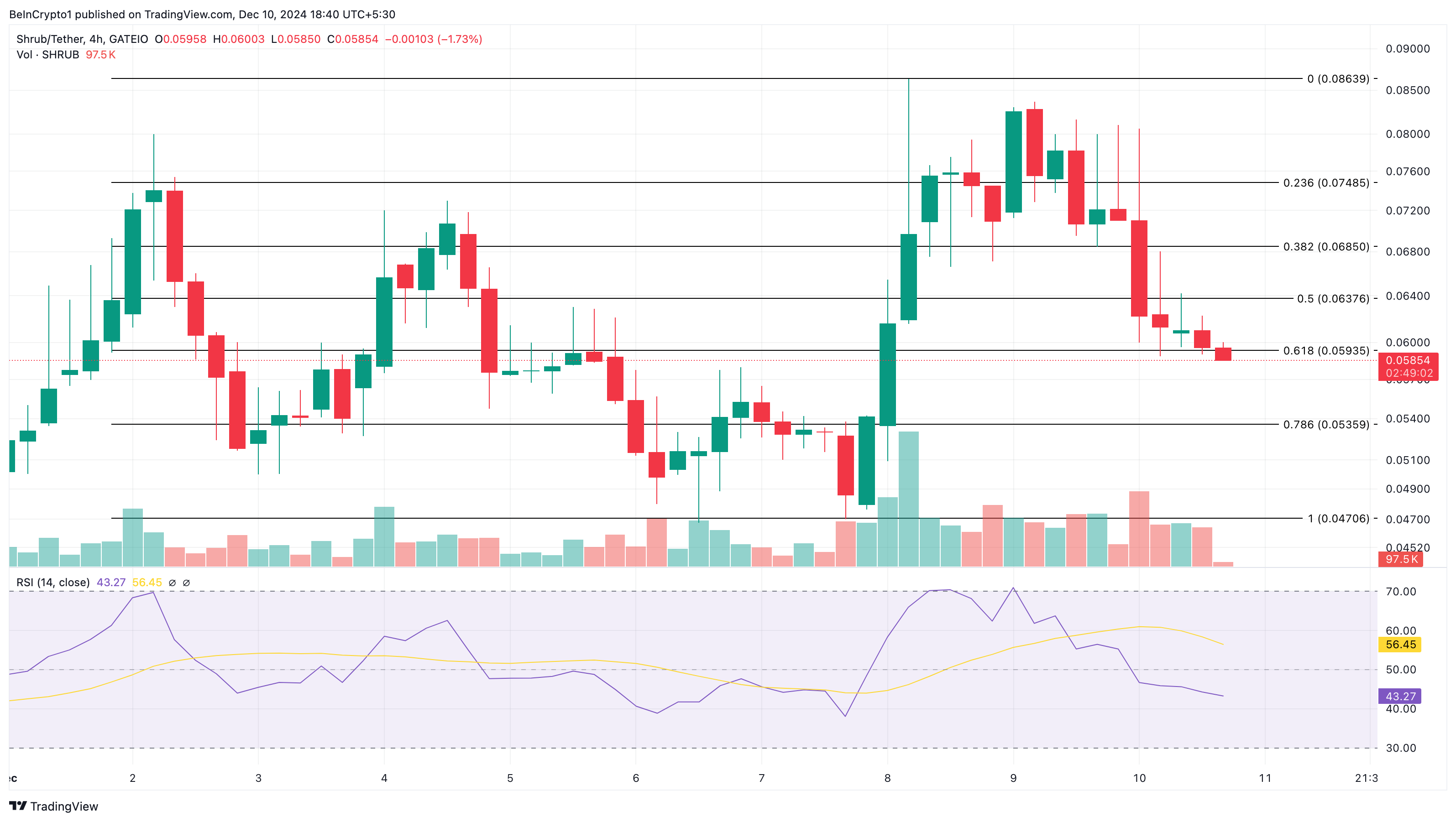 يشير هذا الانخفاض إلى زخم هبوطي حول الرمز. إذا استمر قراءة مؤشر القوة النسبية في الانخفاض، فقد ينخفض سعر SHRUB إلى $0,047. ومع ذلك، إذا زاد ضغط الشراء، فقد ينعكس الاتجاه، وقد ترتفع قيمة العملة الرقمية البديلة إلى $0,086.