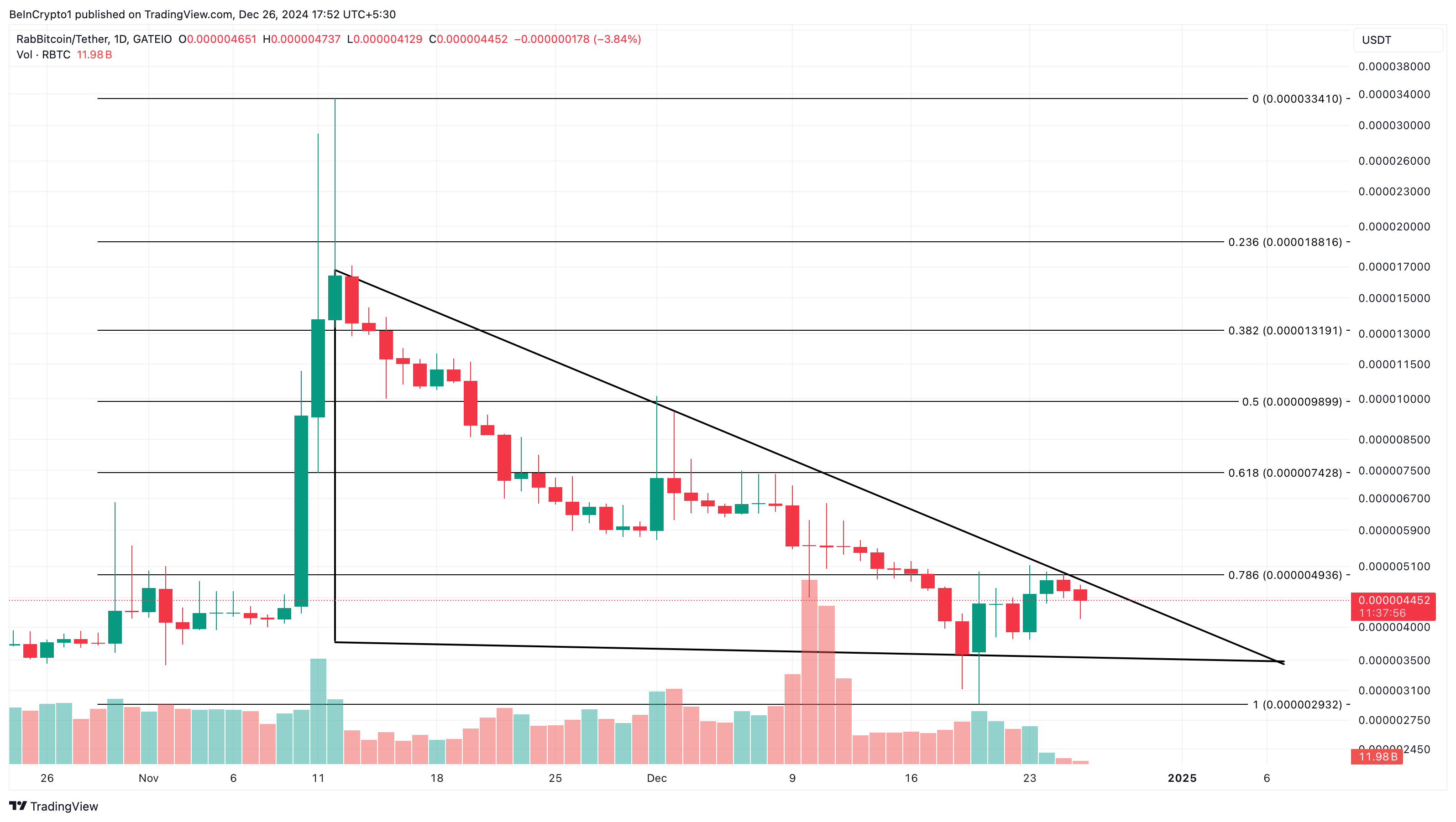 الثاني هو خط اتجاه سفلي أفقي مسطح يمثل مستوى دعم يختبره السعر عدة مرات. بما أن سعر RBTC فشل في الارتفاع فوق خط الاتجاه العلوي، فإنه يشير إلى أن سعر العملة الرقمية قد ينخفض إلى $0,0000029.