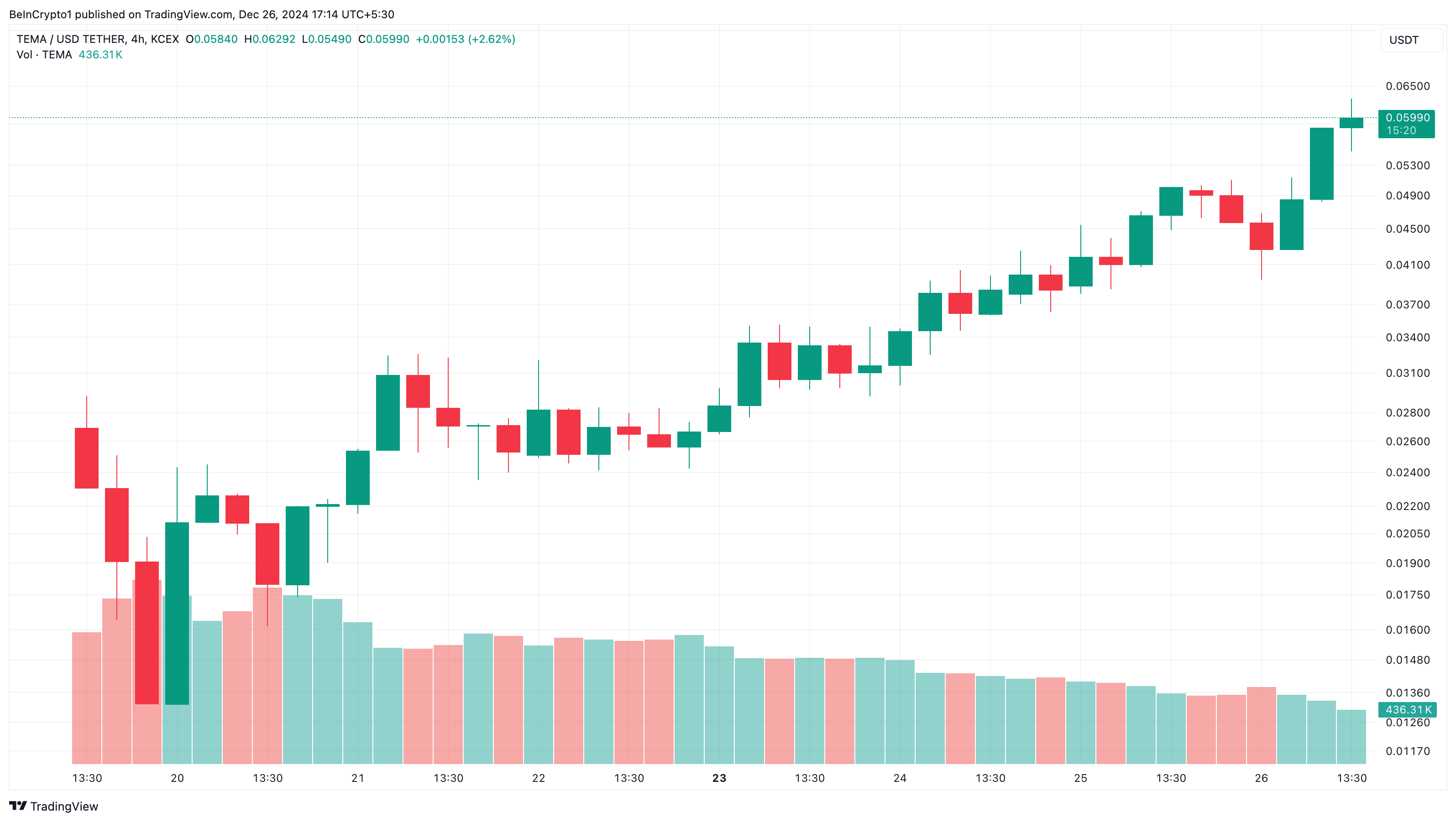 سعر تيم هو $0,060، كما توقعت BeInCrypto مؤخرًا. من منظور تقني، يستمر الحجم حول العملة المشفرة في الارتفاع. إذا استمر هذا الاتجاه، يمكن أن يتحرك قيمة الرمز إلى $0,065 في المدى القصير.