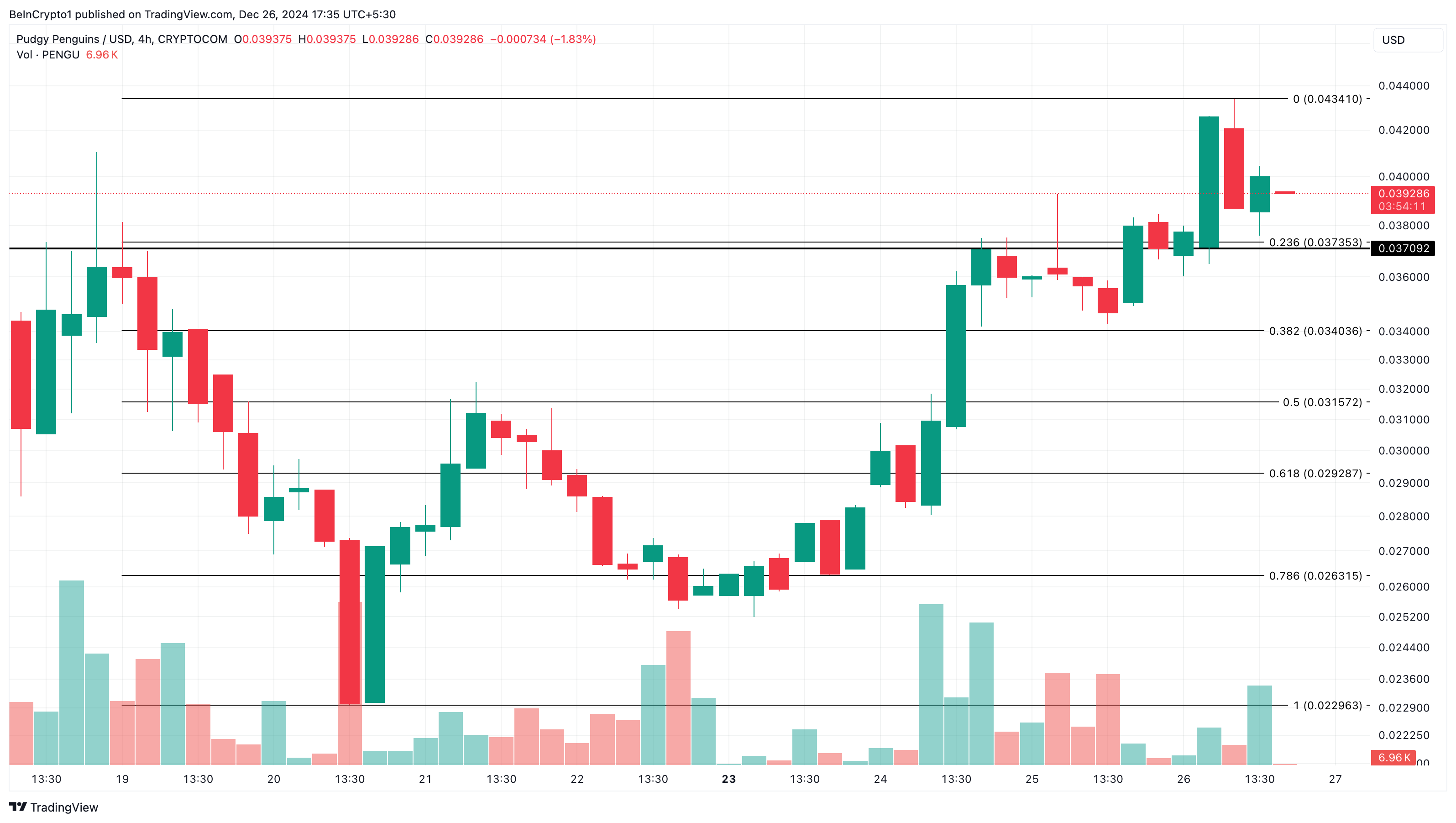 حدث هذا الانقلاب بسبب أداء أسعارهم. بينما شهدت WIF وBONK انخفاضًا بنسبة 6%، ارتفع سعر PENGU بنسبة 15,70% في الـ 24 ساعة الماضية.