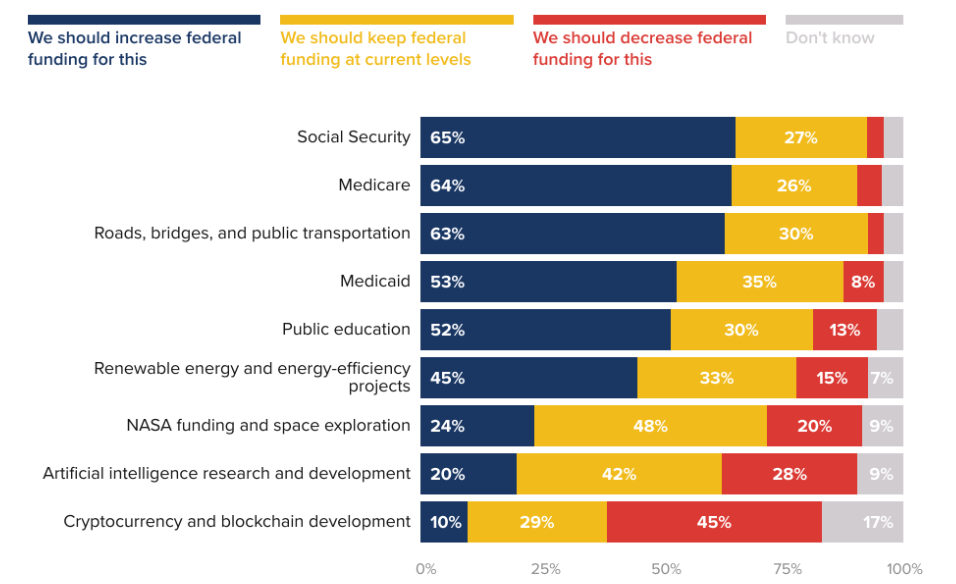 إلى جانب رفض الاحتياطيات المشفرة، يعتقد العديد من الناخبين أن الحكومة الأمريكية يجب أن تقلل من استثماراتها في تطوير العملات المشفرة وblockchain.