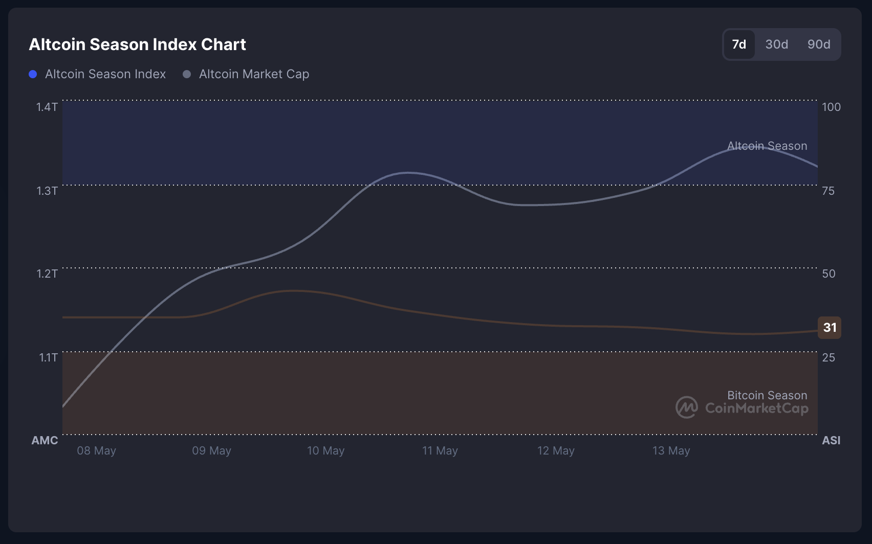 مع القيمة الحالية التي تبلغ 31، يبقى السوق في مرحلة يهيمن عليها بيتكوين، على الرغم من ارتفاع القيمة السوقية للعملات البديلة—مما يبرز أن عددًا محدودًا فقط من العملات البديلة يقود المكاسب.