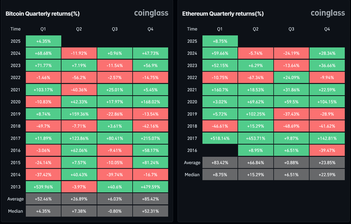 عامل دعم آخر هو الأداء التاريخي لسوق العملات الرقمية في الربع الثاني (Q2). تُظهر البيانات من Coinglass أن الربع الثاني عادة ما يكون من أقوى الفصول لكل من بيتكوين و إيثريوم.